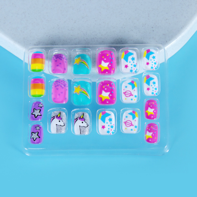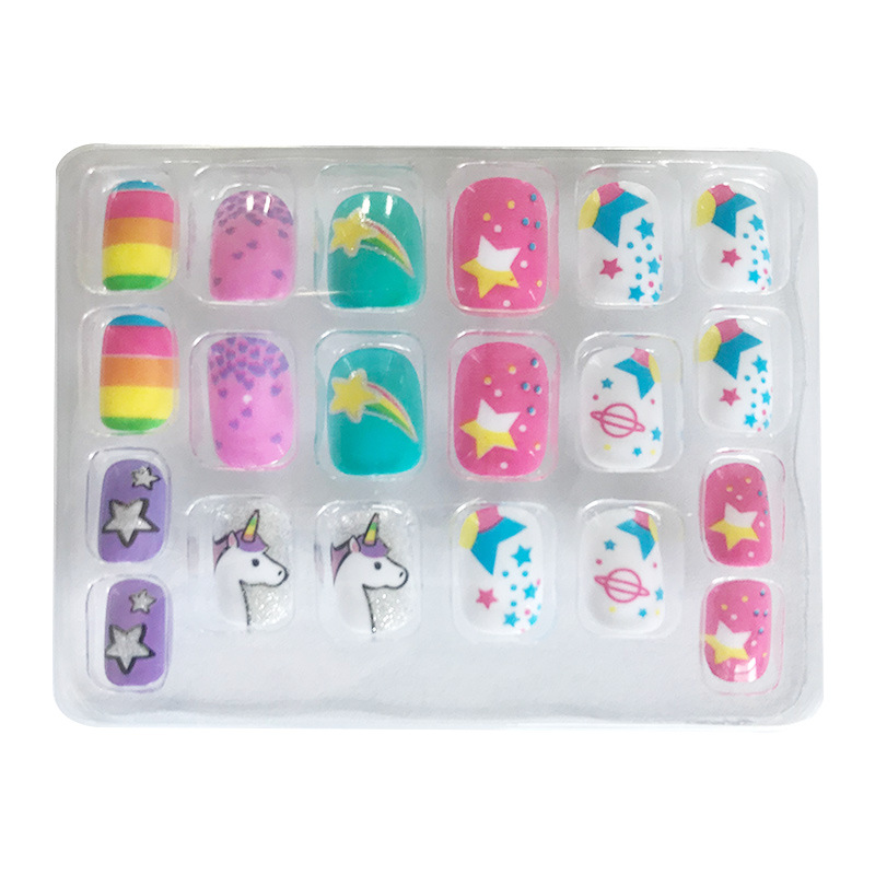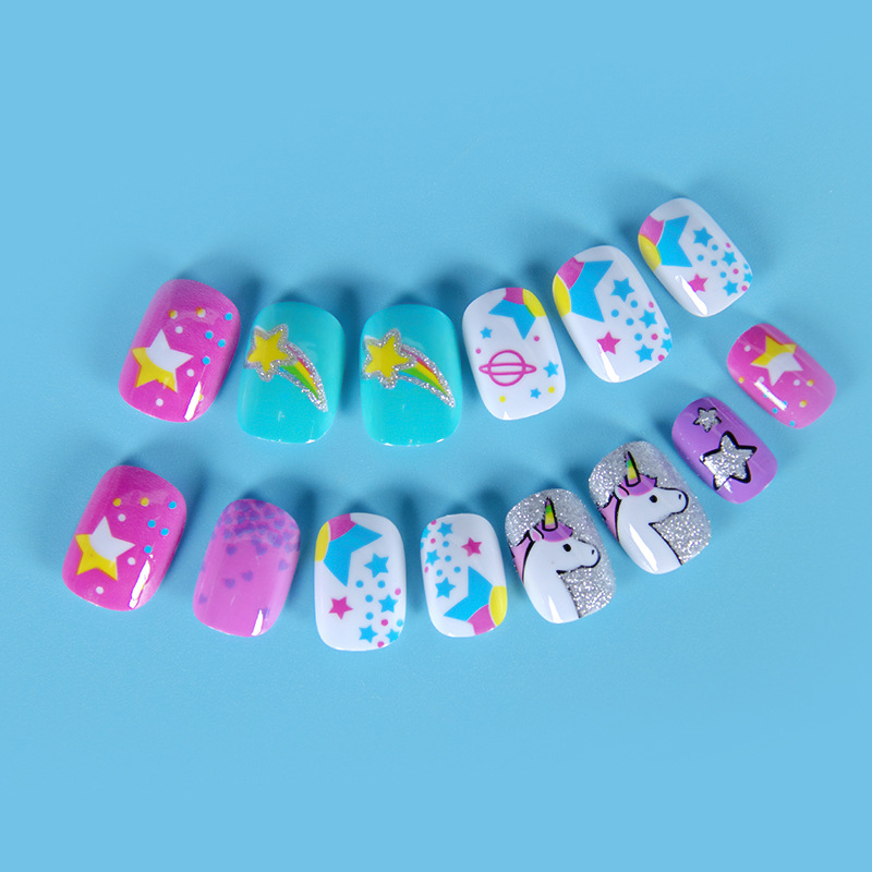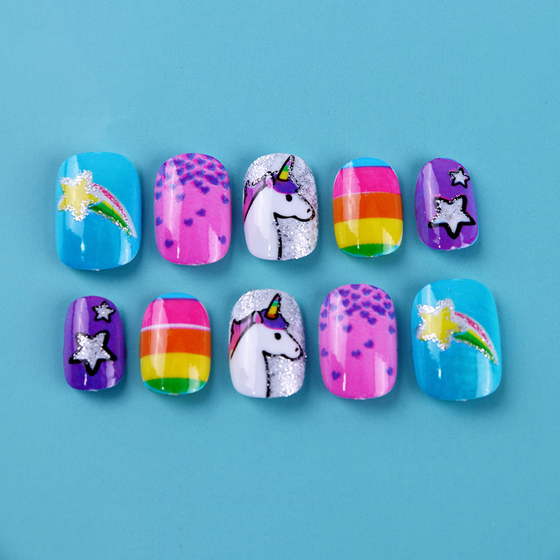 Многоцветные милые накладные ногти в коробке, детские накладные ногти с мультяшными персонажами, короткие накладные ногти в стиле единорога, милые накладные ногти для ношения.