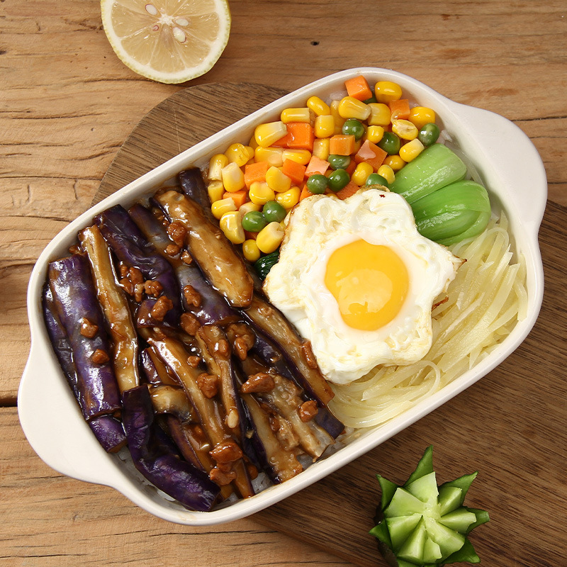 Готовый набор для быстрого приготовления: рисовая миска, полуфабрикаты, картофель, говядина, маленькая миска, замороженное готовое блюдо.