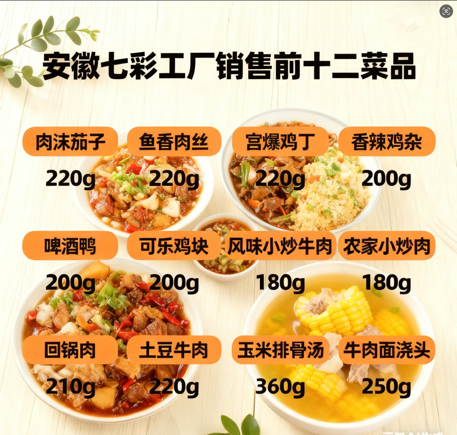 Менеджер магазина рекомендует двенадцать лучших блюд, продаваемых фабрикой.; (Новый продукт) Утиное мясо, обжаренное на сухом огне, 200 г; (Новый продукт) Начинка для лапши Чжаян 180 г; (Новинка) Сладко-кислые свиные ребрышки 200г; (Специальное предложение) Бифштекс с ароматом говядины 180г; Пробный набор для открытия магазина; (Специальное предложение) Ветчина на пару 200г; (Специальное предложение) Свиная отбивная со вкусом 170г; Запеченная свинина с луковыми побегами диких горных бамбуков, 210 г; Три свежих местных продукта 220г.; Блюдо бабушки 160г; Тушеные свиные коптины с соевыми бобами, 250 г; Грибной баклажан 220г; Свинина, обжаренная в фермерском стиле, 180 г; Свиная тушенка с грибами (свинина) 180г; Соус из жареного фарша (свиной соус) 180г; Куриная смесь Эдамаме 220г; Соус Эдамаме жареный 220г; Соус к жареной курице 210г; Рыба в соленой marinada, 220 г; Свиная мясо на пару, 180 г; 3 тушеные головы льва; 1 кусок ароматных свиных отбивных; Слойка свинья с огурцами в маринаде, 180 г; Тушёная свинина с сушёными бобами, 210 г; Говядина с американским черным перцем, 200 г; Одна тушеная утиная нога в терияки; 100 г свиной жира; Свинина жареная с жареным тофу, 200 г; Бразильское барбекю 200г; Лапки утки тушеные соевыми соусами, 200 г; Острая свинячая печень с перцем, 180 г; Домашний тофу 220г; Обжаренный соус из сушеных креветок 210г; Грибная ветчина и яйца 180г; Яйца в соусе томатов 220г; 1 кусок тушеной куриной ножки; 200 г фарша и маринованных бобов; Фармахусская страва 210г; Мясо свинины с рыбным вкусом, измельченное, 220 г; Закисленная фасоль и куриные грибочки 200г; Острая шинкованная свинина 210г; Курица Кунг Пао 220г; Курица Эдамаме Динг 210г; Пикантная курица, ассорти, 200 г; Куриные наггетсы с картофельным карри, 220 г; Лебедь дикая перцовая разные 210г; Гриб шиитаке и курица 220г; Курица на гриле с эдамаме, 210 г; Курка с острой приправой, 200 г; Жареные куриные сердца 170г; Тушеная курица 220г; Пивная утка 200г; Куриные наггетсы с вкусом кока-колы, 200 г; Рыба плиточная 200г; Куриные крылышки с острой приправой, 170 г; Куриные полоски с черным перцем, 200 г; Сладко-кислая свинина 220г; Тысячелистая жареная свинина 220г; Сычуаньская пикантная курица 150г; Мясо в сметане 210г; Копченые куски свинины, 200 г; Треска тушеная 200г; Острое говядино 210г; Тушёная свинина с маринованными овощами, 210 г; Свиное баранчье мясо с пикантным перцем, 200 г; Картофель с говядиной 220 г; Утка тушеная и ребрышки 200г; Солёная рыба и свинина 200 г; Классический говядина, обжаренная на сковороде, 200 г; Тушёная свинина 200г; Тушеные свиные ребрышки 200г; Телятина с прованским перцем, 180 г; Квашеная капуста и жирная колбаса 210г; Говядина тушеная 180г; Опеределка говяжья пикантная 200г; Горячие и кислые кусочки ламинарии (холодные) 200г; Грибы горячие и кислые (холодные) 150г; Острая жареная кожа тофу (холодная) 160 г; Шелк «Красное масло» (холодный) 150 г; Соус в глиняной кастрюле 500 г; Красное масло 500г; Суп из ребрышек и кукурузы 360г; Топпинг Jajangmyeon (свиной соус) 160 г; Топпинг для лапши с жирной кишкой 250г; Топпинг для лапши с говядиной, 250 г; Оригинальный куриный суп 360г.; Топпинг для лапши с ребрышками, 250 г; Курица в майонезе, 250 г; Кордицепс и куриный суп 360 г; Грибной куринный суп 360г; Суп из редьки и свиной кости 360 г; Суп из свиной щечки и курицы 360; Суп из кукурузы и свиной ребрышки 360 г; Суп из корня лотоса и свиной кости 360 г; Л Сохраненное яйцо и каша из нежирной свинины 400г; Паста из красной фасоли с османт
