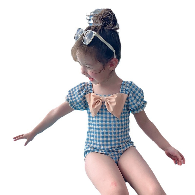 Купальник для девочек в корейском стиле, новинка лета 2024, цельный купальник в клетку для маленьких девочек с шапочкой и защитой от солнца