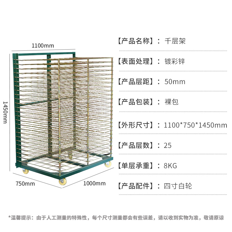 明确你在使用千层架过程中,是否需要进烤箱,如需高温作业环境,则需换耐高温轮及选用耐高温油漆;非高温环境,普通轮子即可。