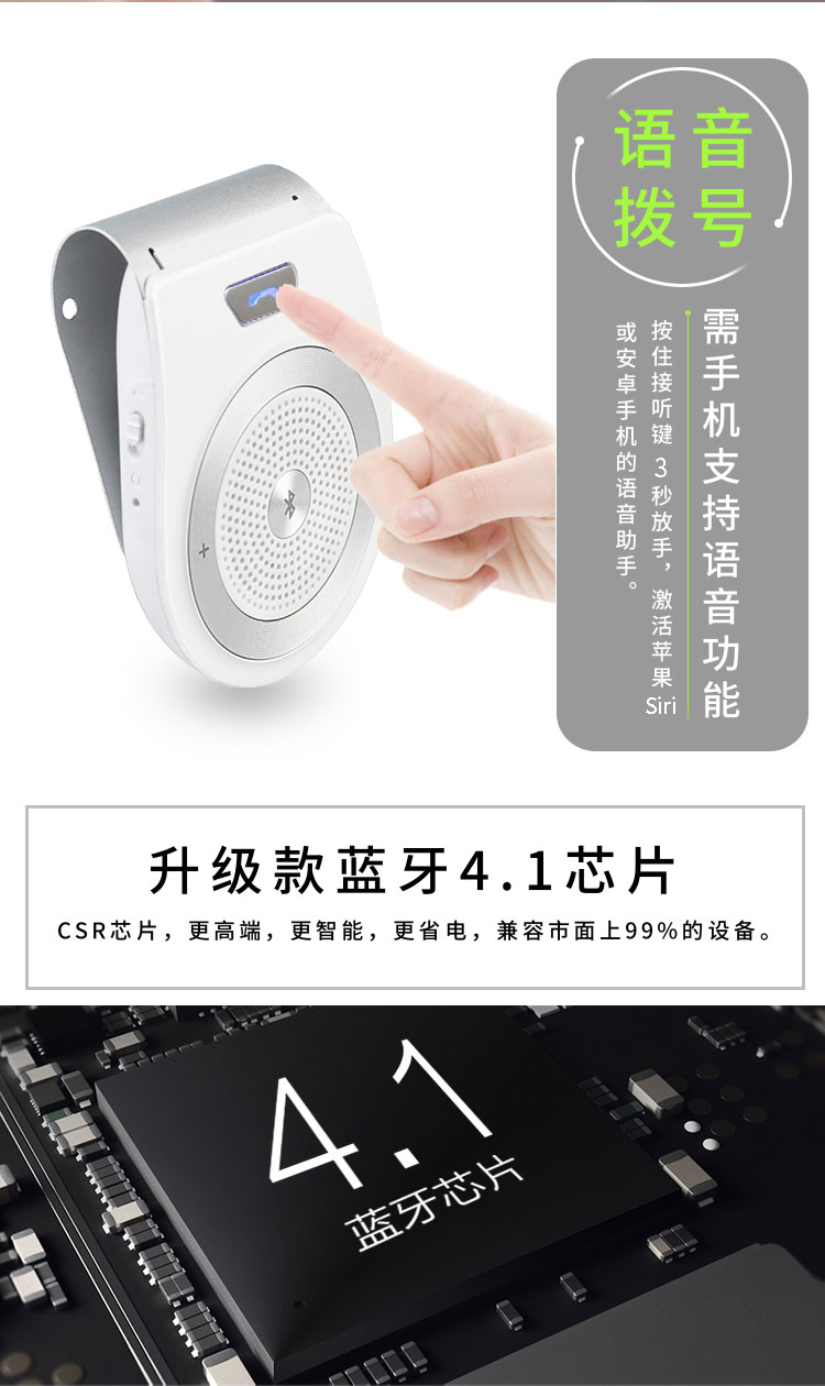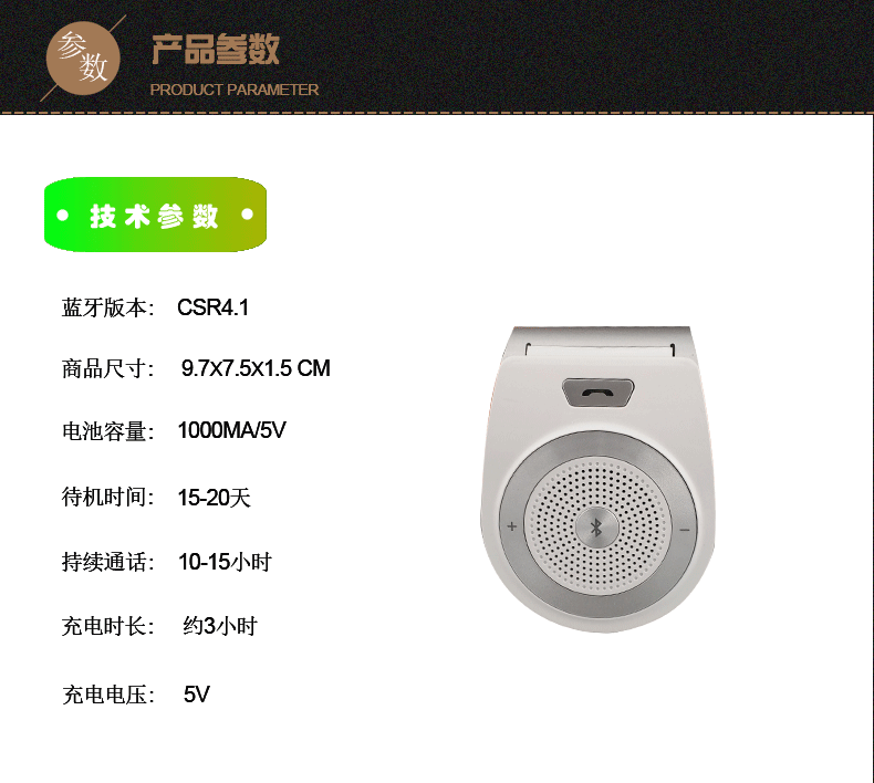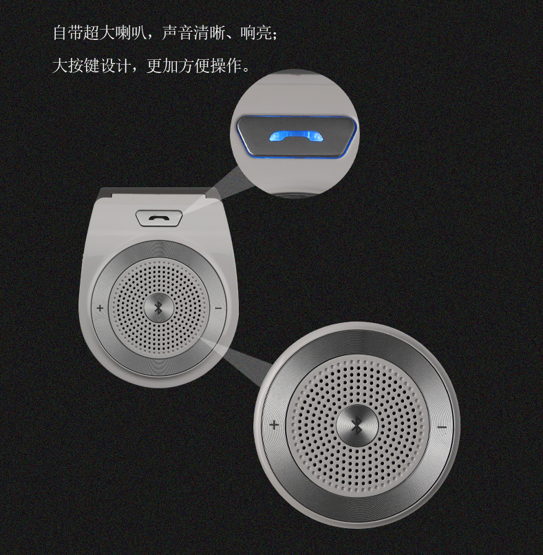 2016年重磅推出新款车载蓝牙免提,携全新设计隆重登场,带语音提示,支持双连接,大气外观,不会掉档次.希望与各位共同携手打造蓝牙市场天下.喇叭40MM 8R 2W 电池1000MA.