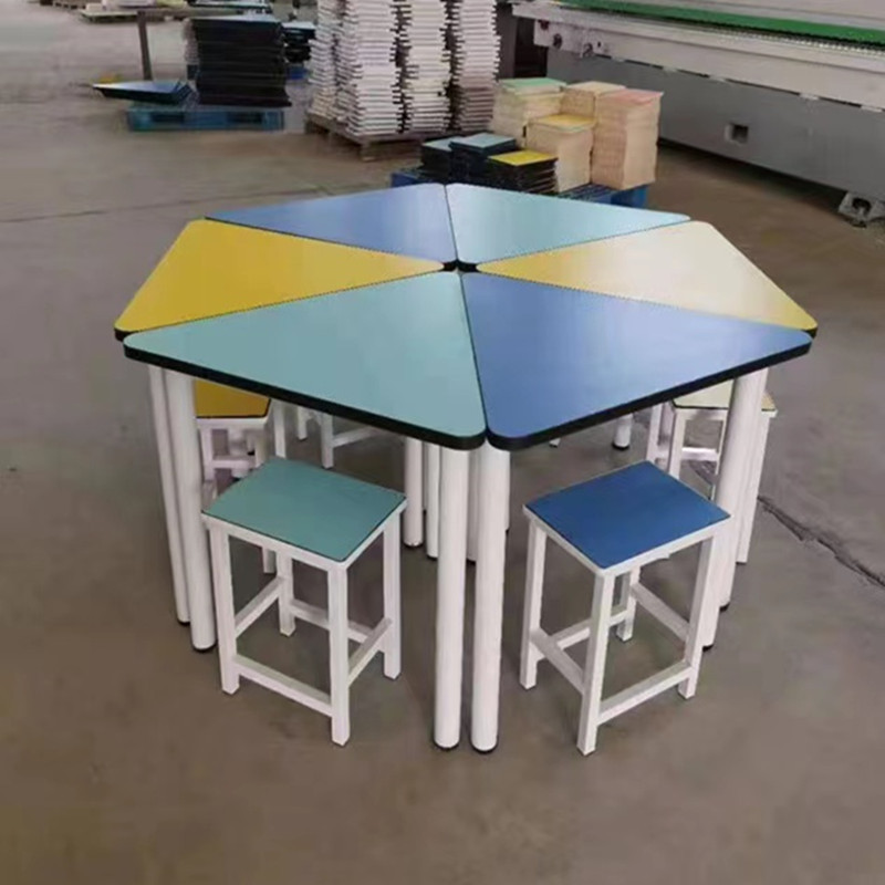 Шестиугольные комбинированные веерообразные столы для начальных и средних школ, трапециевидные столы для групповых занятий, художественные столы, столы для чтения, столы для проведения научных экспериментов.