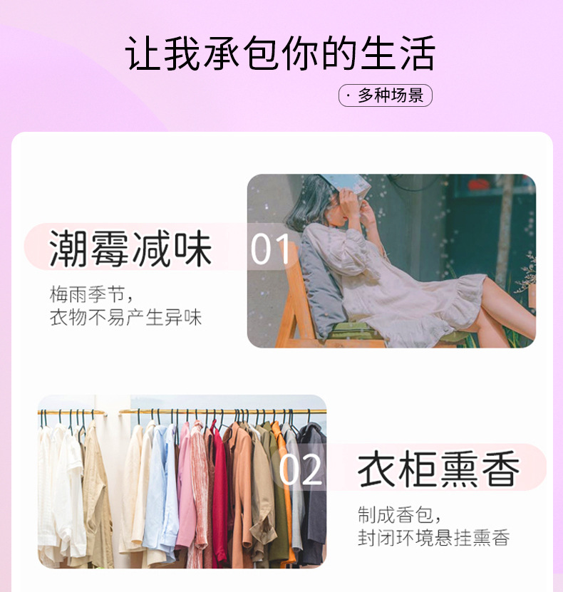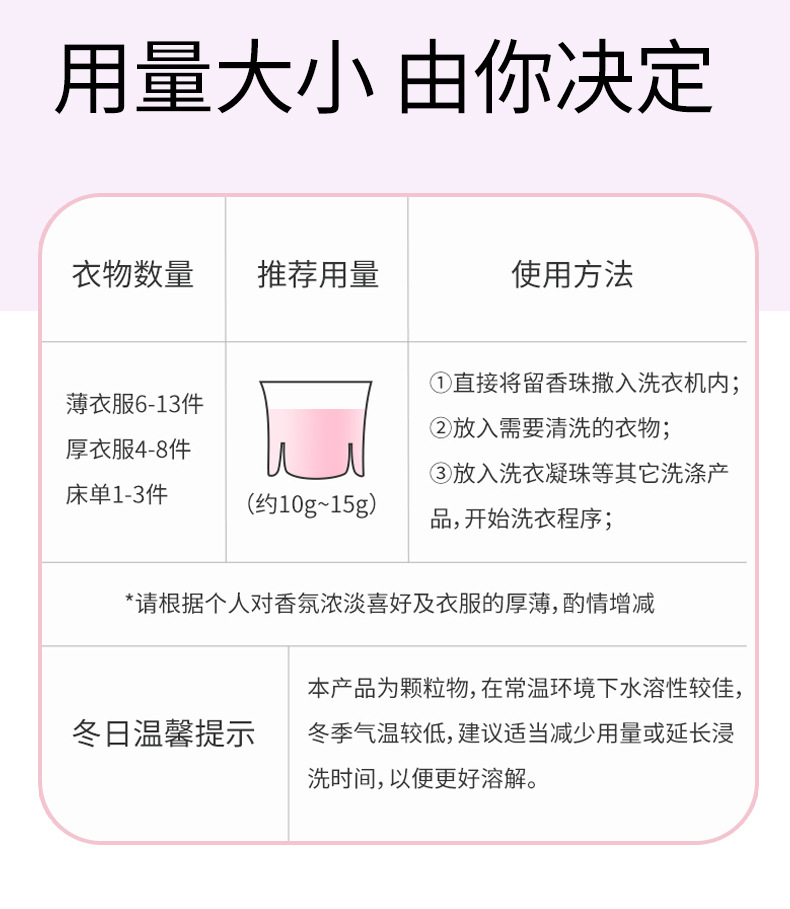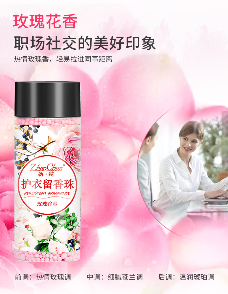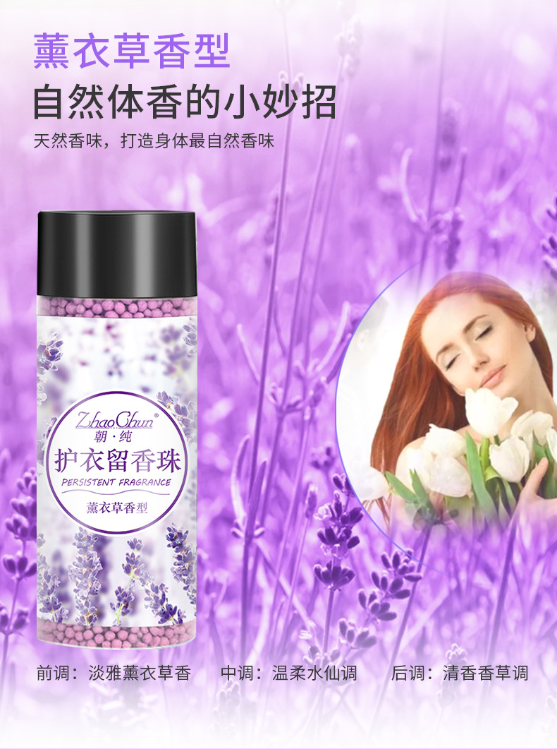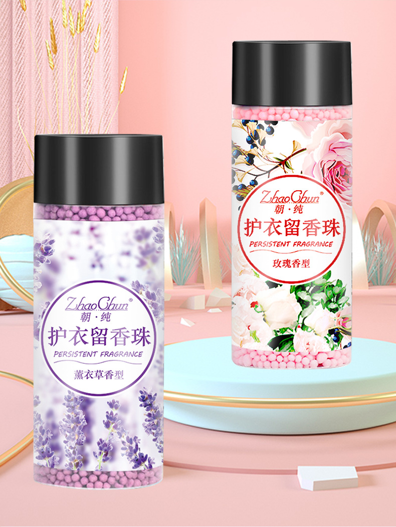 采用微胶囊缓释技术,高浓度留香珠(约可使用30-40次),四种香味可选(支持定制其他香型),常规款有:粉色花香,紫色薰衣草,绿色果香,黄色柠檬。含三重香氛体系:前调(柑橘/海洋)、中调(茉莉/铃兰)、后调(檀香/麝香),实现72小时衣物锁香。