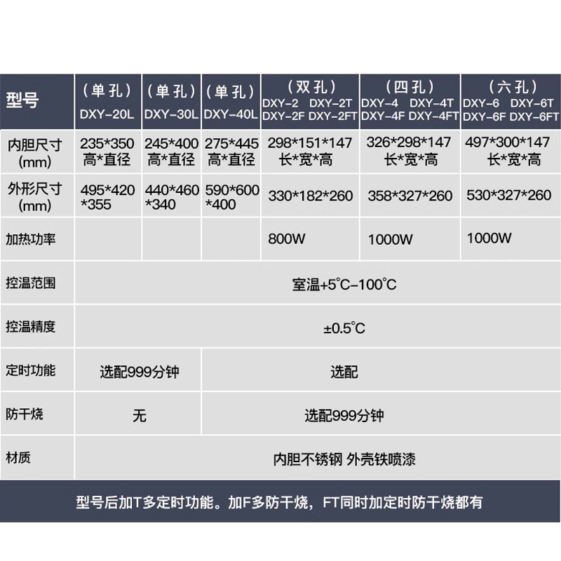 Водяная баня с одним отверстием DXY-1; Водяная баня с одним отверстием DXY-1T (своевременная версия); Однорабочая водяная бана 2-литровая DXY-2L; Однорабочая водяная бана 5 литров DXY-5L; Однорабочая водяная бана 5 литров DXY-5L-T (своевременная версия); Однорабочая водяная бана 7л DXY-7л; Однорабочая водяная бана 7 литров DXY-7L-T (временная версия); Однорабочий горшок для водяной бани 10 литров DXY-10л; Однорабочий горшок для водяной бани 10 литров DXY-10L-T (временная версия); Однорабочий горшок для водяной бани 12 литров DXY-12L; Однорабочий горшок для водяной бани 12 литров DXY-12L-T (своевременная версия); Однорабочая водяная бана 20 литров DXY-20L-T (временная версия); Однорабочая водяная бана 30 литров DXY-30L-T (временная версия); Однорабочая водяная бана 40л DXY-40L-T (временная версия); Водяная баня с двойным отверстием DXY-2; Водяная баня с двойным отверстием DXY-2F (антисухое горение); Водяная баня с двойным отверстием DXY-2T (своевременная версия); Водяная баня с двойным отверстием DXY-2TF (модель с защитой от высыхания по времени) удалена; Водяная баня с четырьмя отверстиями DXY-4; Водяная баня с четырьмя отверстиями DXY-4F (антисухое горение); Водяная баня с четырьмя отверстиями DXY-4T (временная версия); Водяная баня с четырьмя отверстиями DXY-4TF (модель с защитой от высыхания времени); Водяная баня с шестью отверстиями DXY-6; Водяная баня с шестью отверстиями DXY-6F (антисухое горение); Водяная баня с шестью отверстиями DXY-6T (временная версия); Водяная баня с шестью отверстиями DXY-6TF (модель с защитой от высыхания времени); 2л электрическая смесительная водяная бана с постоянной температурой DXY-2LD; 5л электрическая смесительная водяная бана, постоянная температура DXY-5LD; 5л электрическая смесительная водяная бана, постоянное время температуры DXY-5LD-T; 7л электрическая смесительная водяная бана, постоянная температура DXY-7LD; 7л электрическая смесительная водяная бана, постоянное время температуры DXY-7LD-T; Электрическая смесительная водяная бана, 10 л, постоянная температура DXY-10LD; Электрическая смесительная водяная бана, 10 л, постоянное время температуры DXY-10LD-T; 12л электрическая смесительная водяная бана с постоянной температурой DXY-12LD; 12л электрическая смесительная водяная бана, постоянное время температуры DXY-12LD-T; Электрическая смесительная водяная бана, 20 л, постоянное время температуры DXY-20LD-T