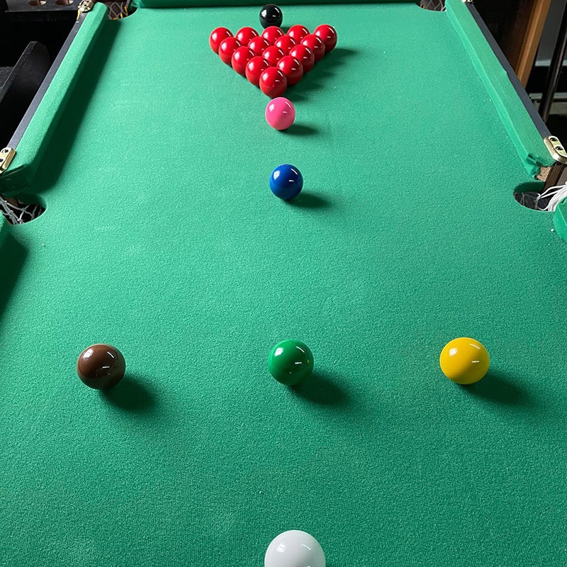 用三角框将15个彩球摆成三角形,8号球摆放在第三排中间,其余全色和花色球要尽量差开摆放。顶点上第一颗球,放置在置球点上,彩球要摆正紧靠,不可有空隙。