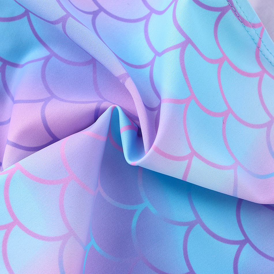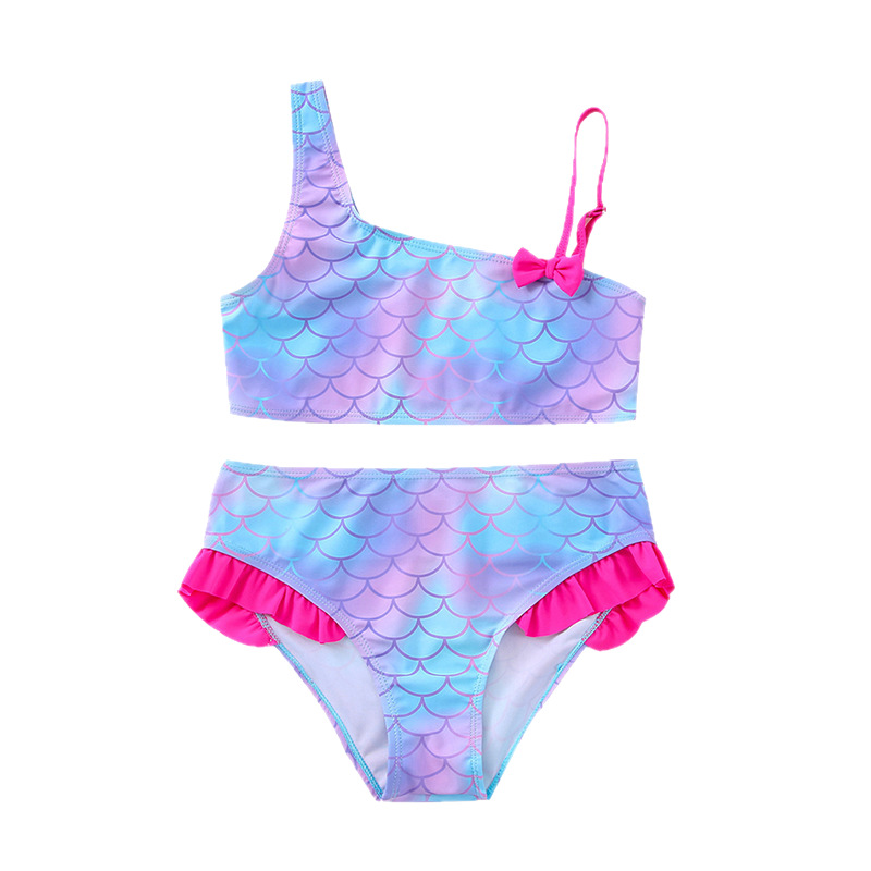 2022外贸新款鱼鳞印花儿童泳装 斜肩性感女童比基尼泳衣套装