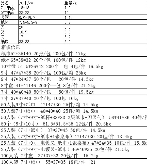 [7-дюймовая бумажная тарелка]; [9-дюймовая бумажная тарелка]; [Одноразовый бумажный стаканчик]; [Одноразовые бумажные полотенца]; [УФ нож]; [УВ вилка]; [УВ ложка]