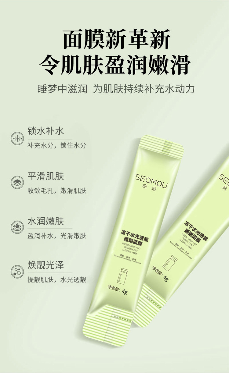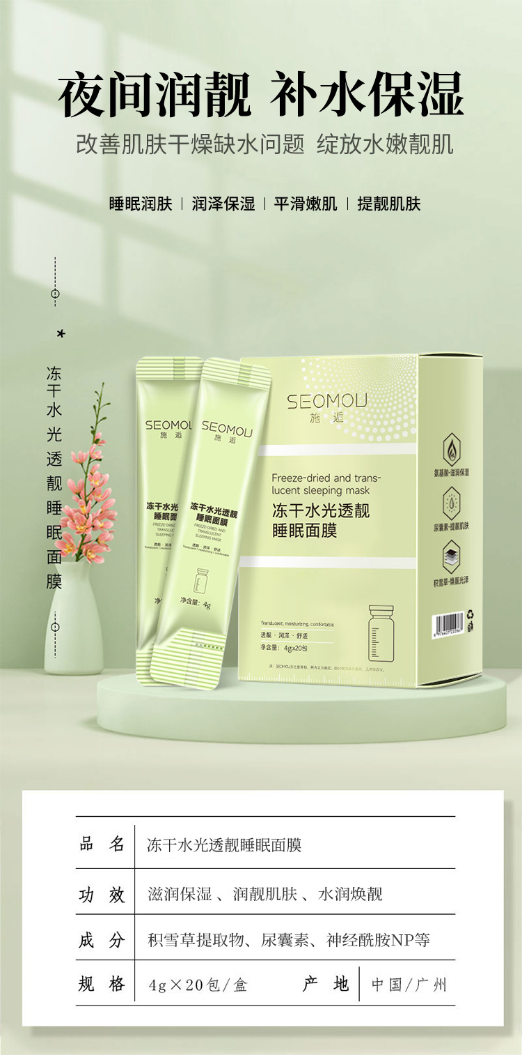Литофризированная увлажняющая и полупрозрачная маска для сна SEOMOU [4 г*20 пакетиков/коробка]; SEOMOU Collagen Firming Good Night Jelly Mask [20 шт./кор.]; SEOMOU Фуллереновая сублимационная увлажняющая ледяная маска [20 шт./кор.]; Ледяная эссенция для кожи, сублимационная увлажняющая и полупрозрачная маска для сна [4 мл*100 упаковок/коробка]; Ледяная маска для сна Ice Skin Essence Stay Up Late and Age Reverse Freeze-Dried [4 г*20 пакетиков/коробка]; Ice Skin Essence Двойной увлажняющий и омолаживающий набор эссенций для ухода за кожей (утренний C и ночной A) [60 шт./кор.]; Ice Skin Essence Увлажняющая маска Bosein Age-Freezing [20 шт./упак.]; Легкая маска Ice Skin Essence Stay Up Late [100 г/кор.]; Желейная маска «Хорошего ночного сна» с коллагеном и календулой Ice Skin [20 пакетиков в упаковке]; Увлажняющая ночная желеобразная маска с экстрактом голубых водорослей Ice Skin