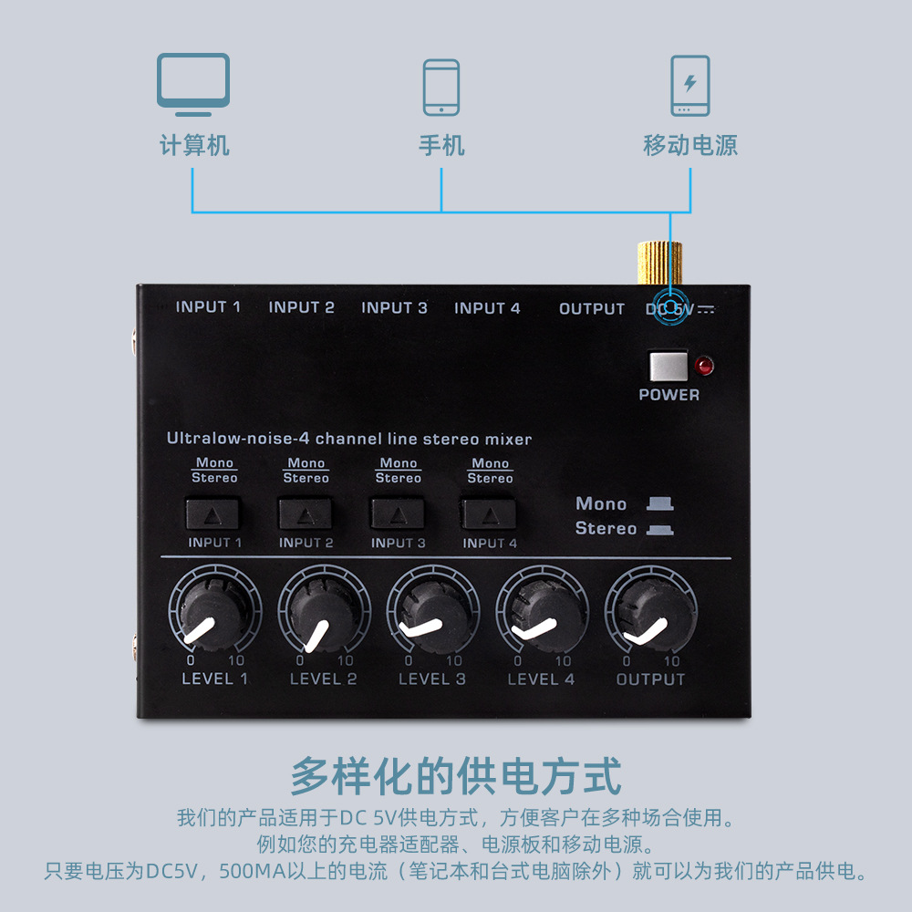 【DC 5V Power Supply】The digital mixer uses the latest DC 5V power supply mode, so it no longer restricts the application scenarios. NOTE: Please use an external power supply with CE or UL certification, and stay away from the interference source, otherwise it will cause noise and other undesirable interference to the product. (Adapter included)