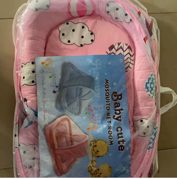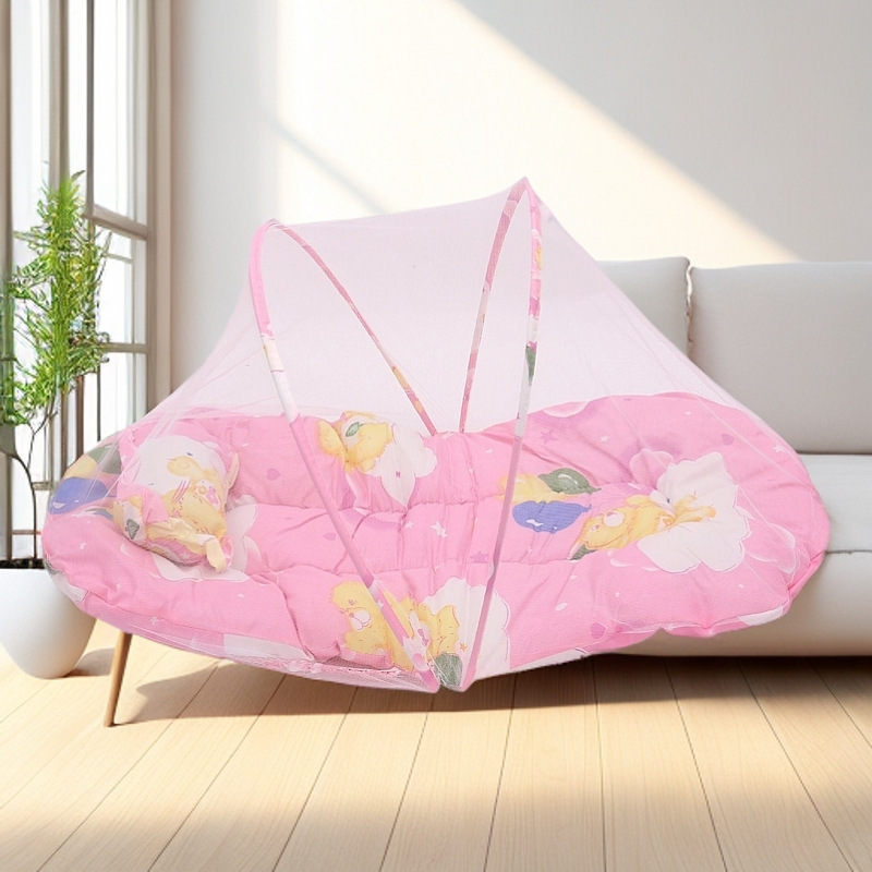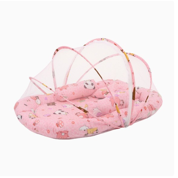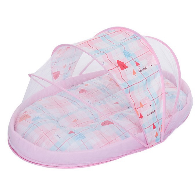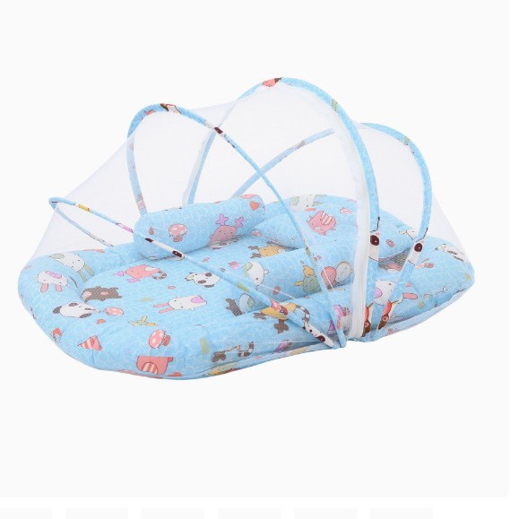 对折设计,使用简单,只需轻松伸展,;蚊帐采用优质活纶网布精工制作,具有防蚊避虫,挡风沙的作用,全套含网眼蚊帐附赠棉被垫、可爱小棉枕头,更柔软更舒适。