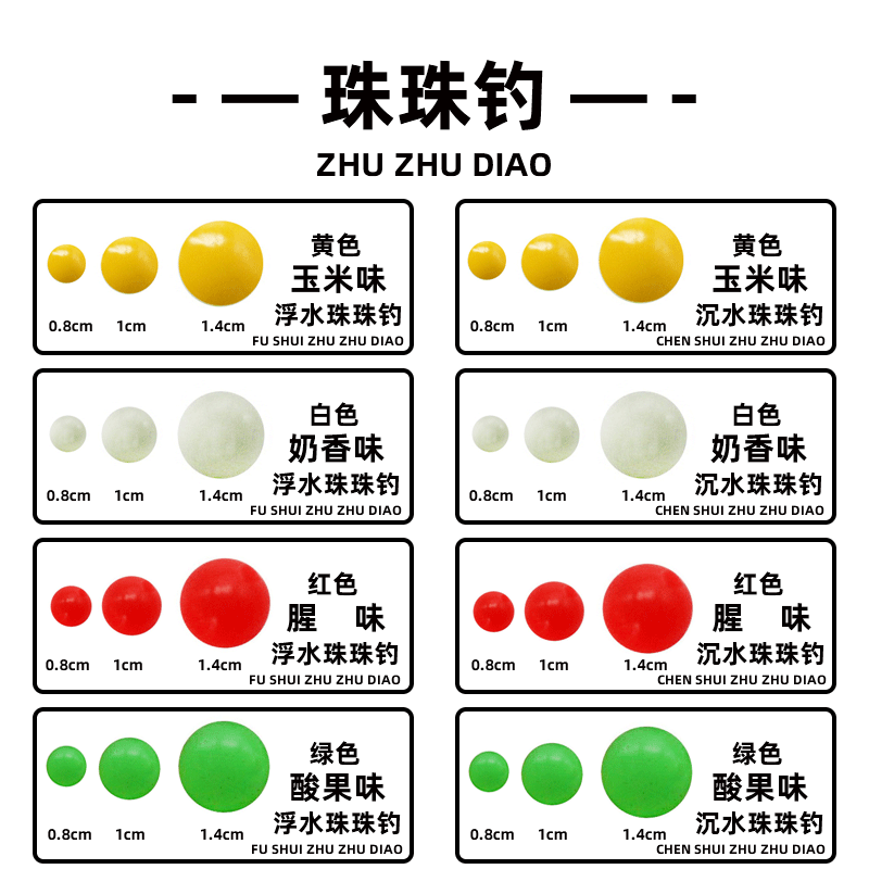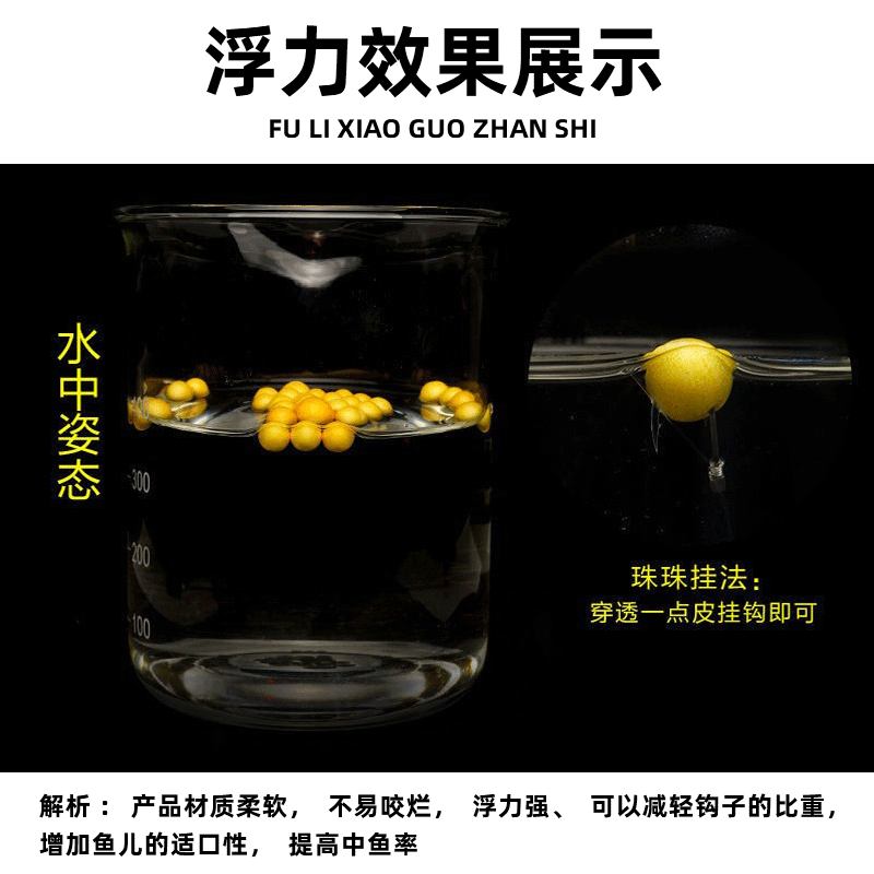 注意:根据水域不同,或者钩子材质的不同,浮力球的浮力也会有细微变化,钩一粒带不动时,可以多挂几粒