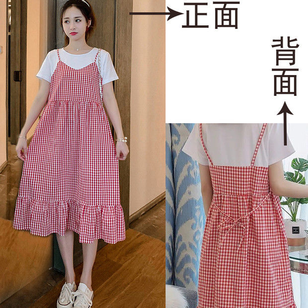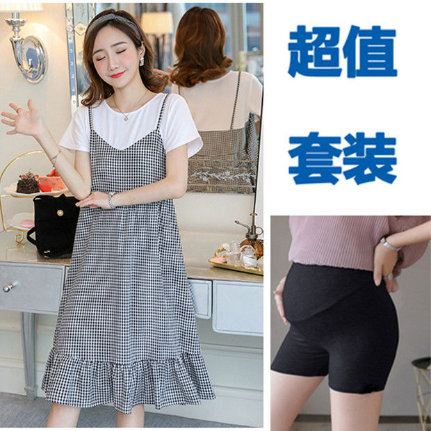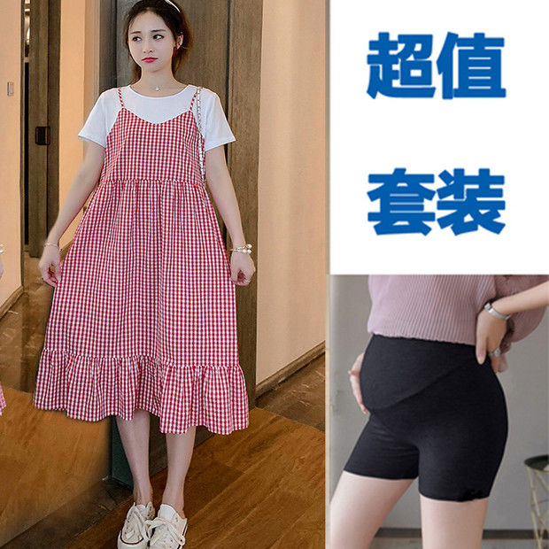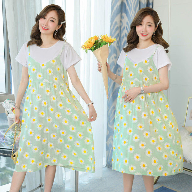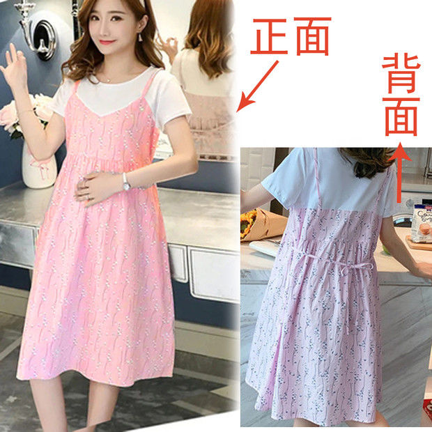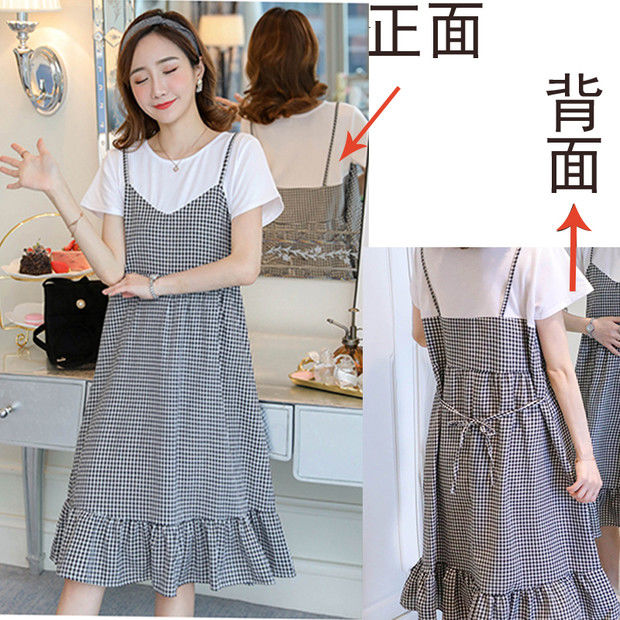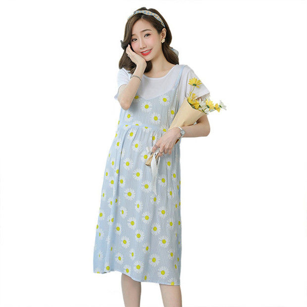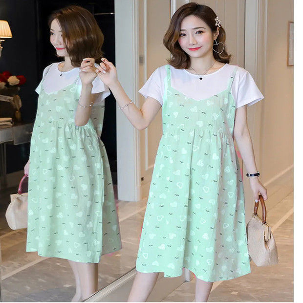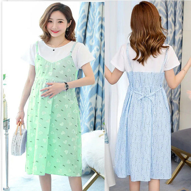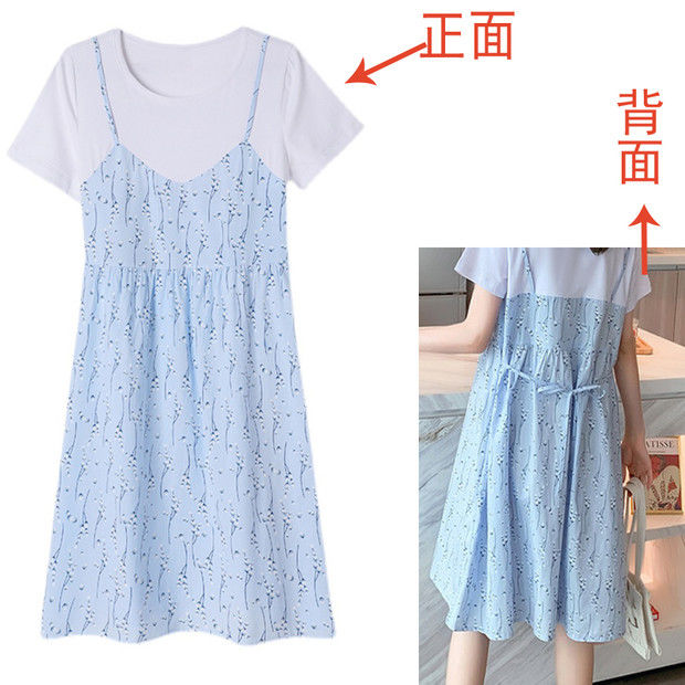 2022新款孕妇装网红夏装假两件连衣裙拼接短袖中长款宽松甜美裙子