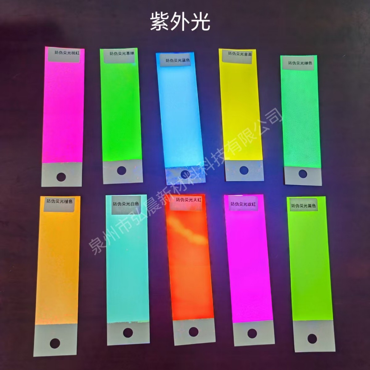 无色荧光防伪油墨其主要的功能就是隐形:自然光和普通灯光照射下不显颜色看不见产品印刷的内容,(印刷品中图案不可见);在长波365nm照射时,印刷品中图案为荧光色,纸张选择对荧光效果有影响,一般建议使用无荧光纸和低荧光纸印刷长波荧光油墨,这样印刷出来的防伪标示的荧光颜色鲜艳和荧光颜色无偏差(我们知道如果使用有荧光的纸张印刷荧光油墨,由于纸张中的荧光增白剂的影响印刷出来的产品亮度和颜色是有偏差的);如果用带有荧光增白剂的纸张印刷,在长波365纳米波长照射时显很浅的荧光效果。