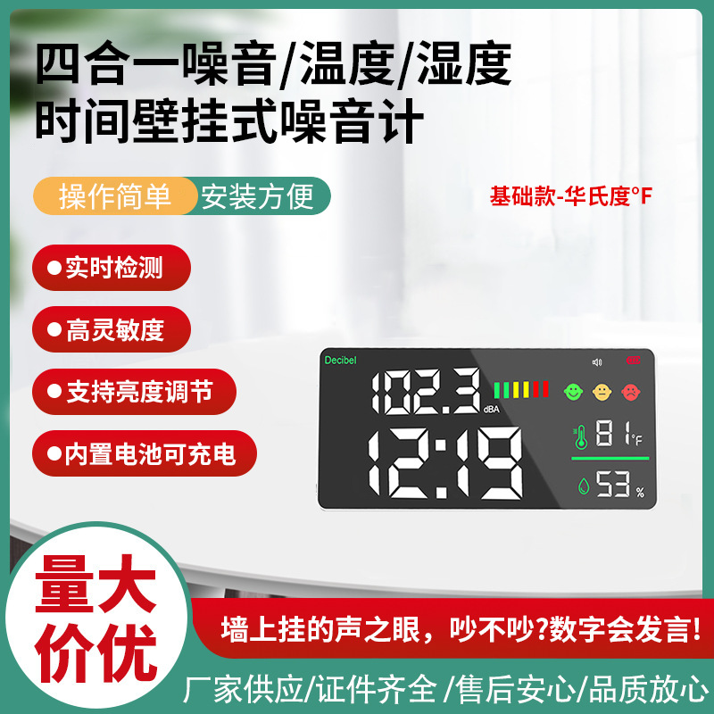 This product is a sound level decibel noise meter 4 in One . It adopts advanced acoustic sensors and precise measurement technology,real-time display noise, time ,temperature and humidity on its LED screen . It is with the 3-color emoji and bar symbols, which visualizes the noise level.