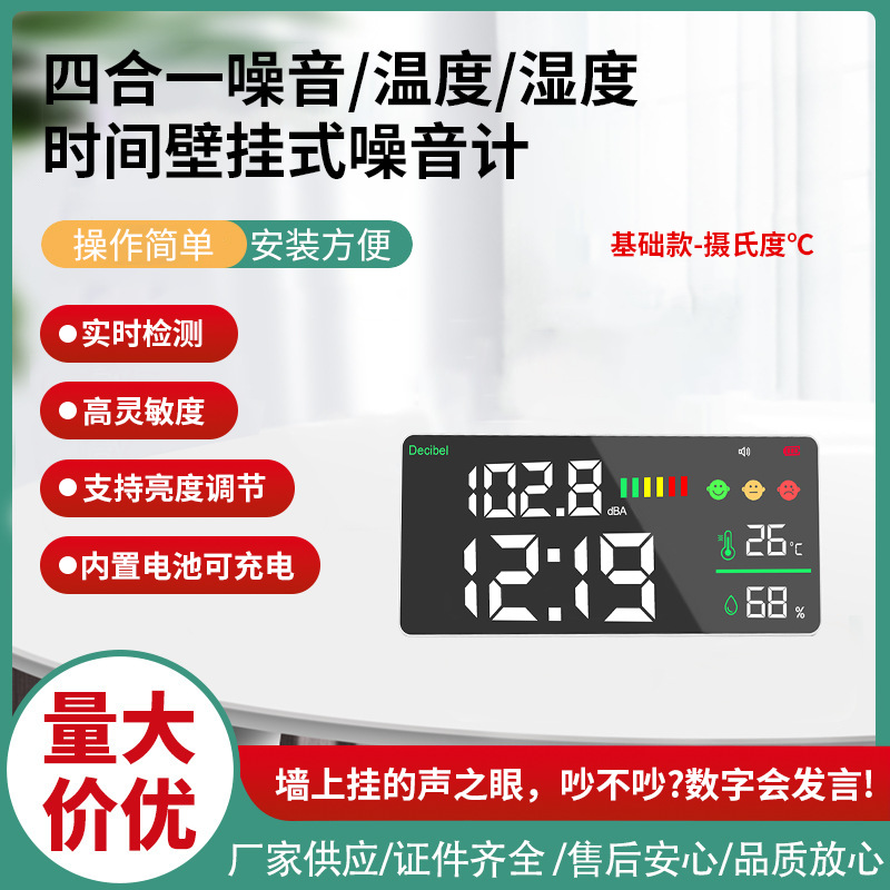 本产品是一款4合一声级分贝噪声计。它采用先进的声学传感器和精确的测量技术,在LED屏幕上实时显示噪音、时间、温度和湿度。它带有三种颜色的表情符号和条形符号,可以将噪音水平可视化。它不占用空间,可以挂在墙上。无论是办公室、工厂车间、学校还是医院,它都能为您提供可靠的噪声数据。使您能够清楚地了解噪音水平,以便采取有效的降噪措施。这种壁挂式噪音计为您创造了一个宁静舒适的环境,保护了您的生活和工作空间。