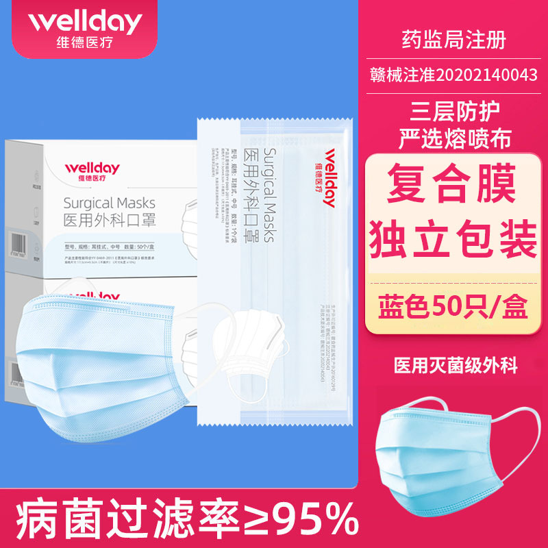 Медицинская хирургическая маска Wellday Vader, одноразовая трехслойная стерилизация для взрослых, независимая упаковка 50 шт./коробка