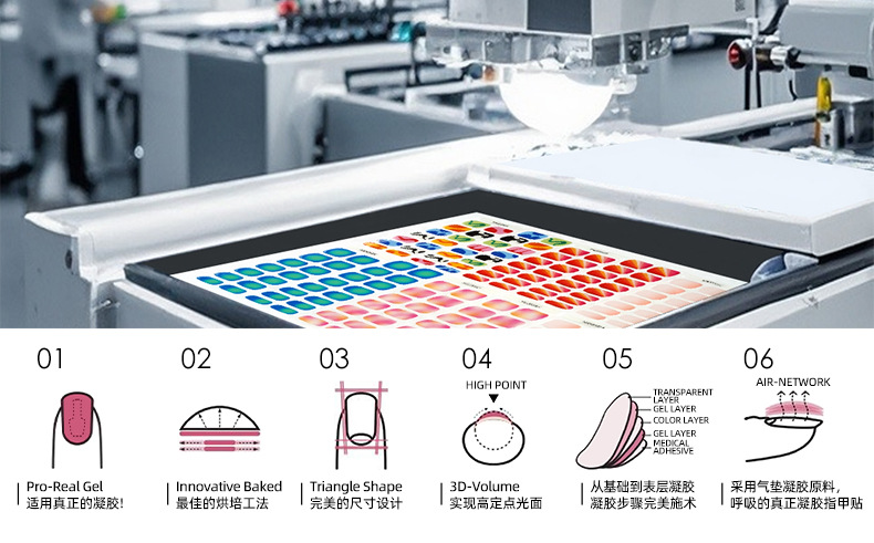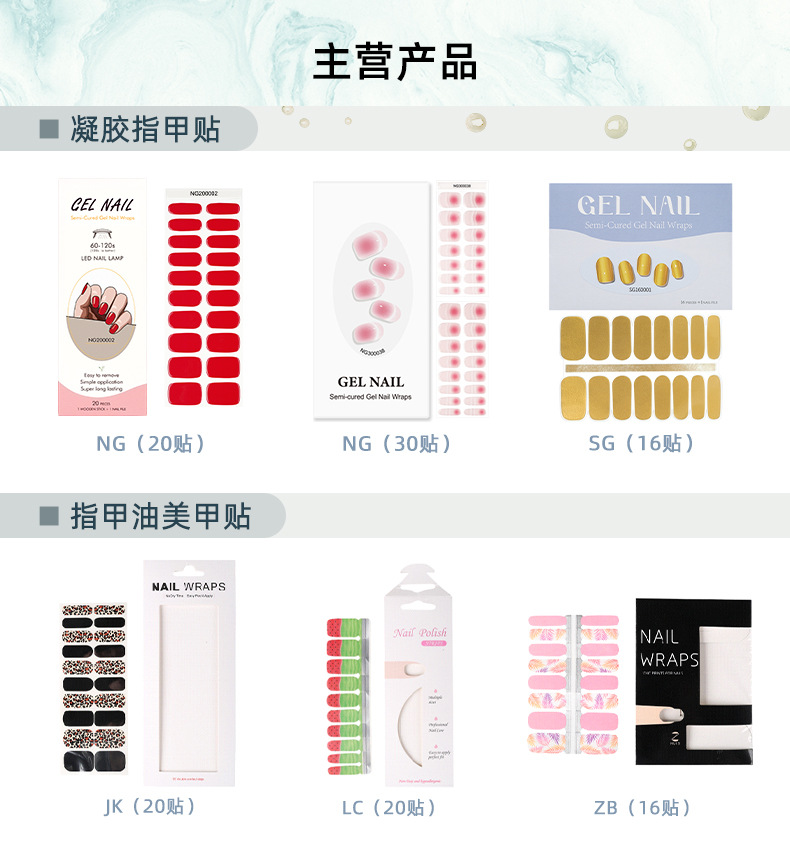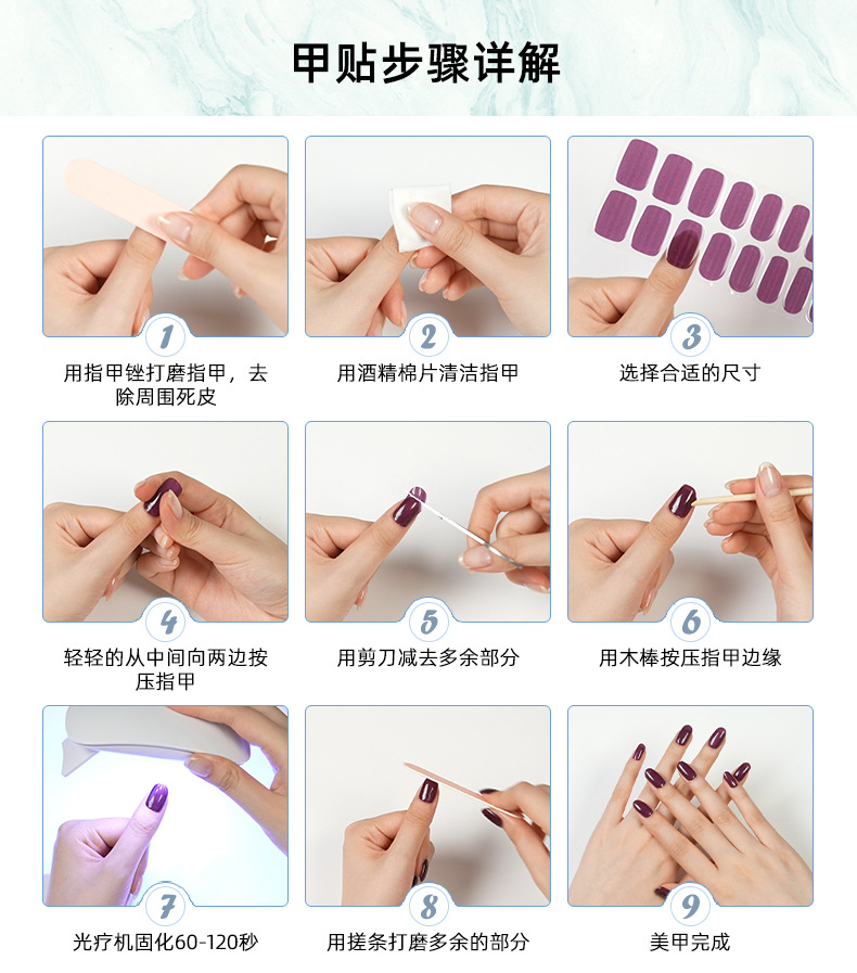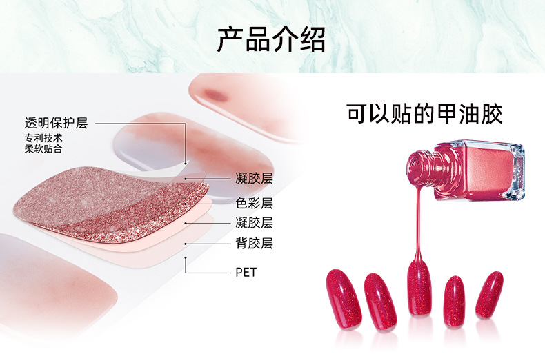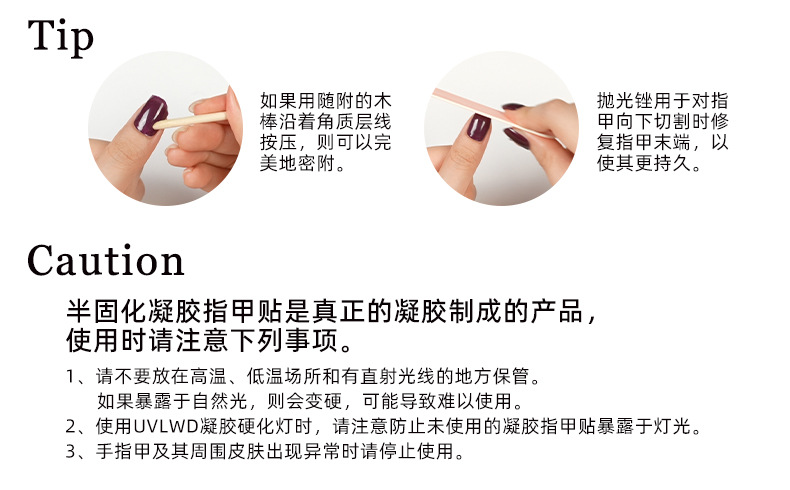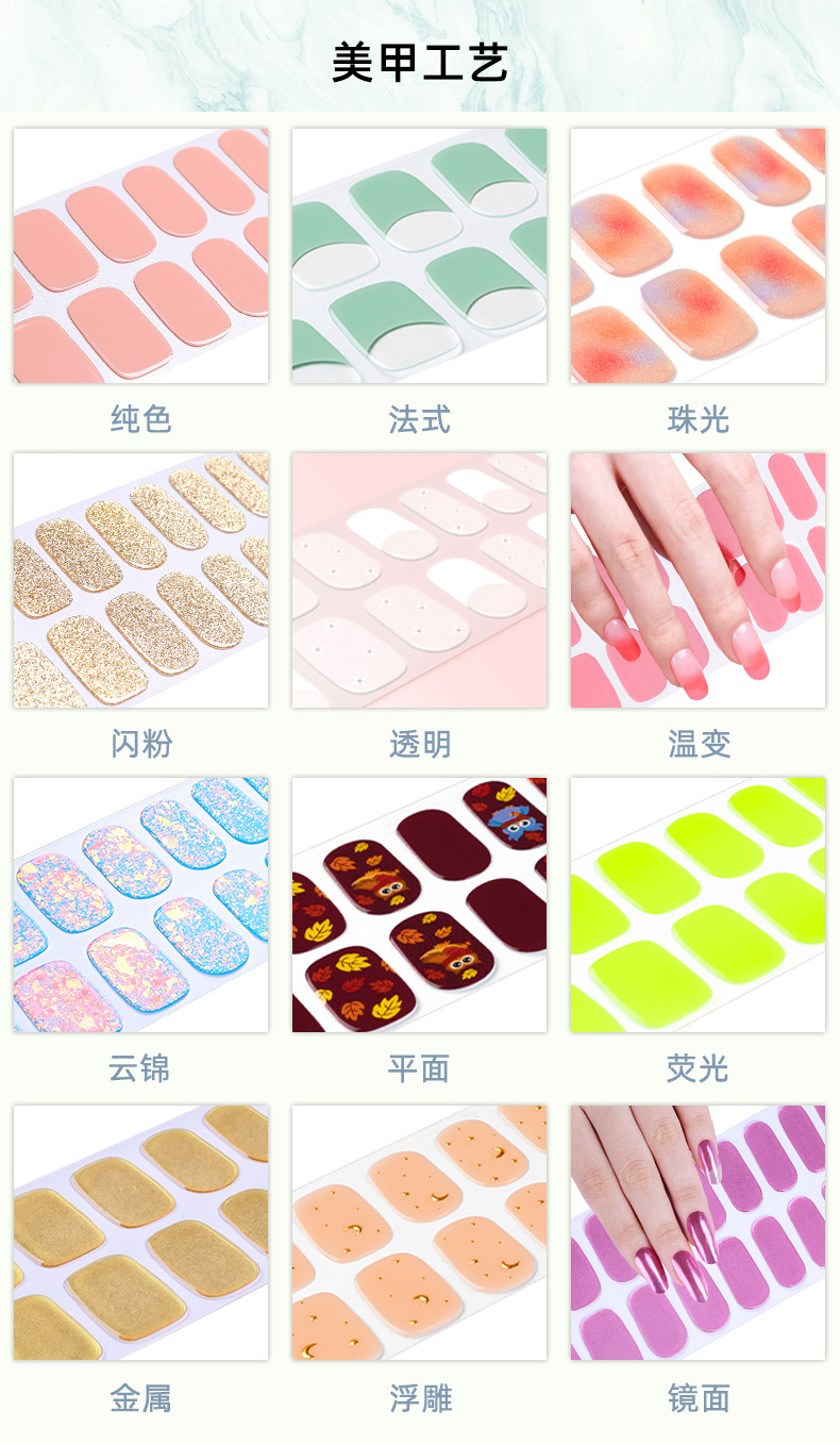 凝胶美甲不是一般的普通塑料美甲贴,是由甲油胶成分制作而成的,照灯后更亮且环保 SGS、FDA认证