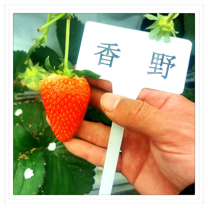2红颜草莓(又称红颊草莓,日本99号,红脸颊),是目前最优秀的日本系列草莓。红颜草莓生长势强,植株较高(25厘米),结果株径大,分生新茎能力中等,叶片大而厚,叶柄浅绿色,基部叶鞘略呈红色,匍匐茎粗,抽生能力中等,花序梗粗,分枝处着生一大一小两完全叶。每个花序4至5朵花,花瓣易落,不污染果实。该品种果个较大,最大可达100多克,一般30至60克。果实圆锥形,种子黄而微绿,稍凹入果面,果肉橙红色,质密多汁,香味浓香,糖度高,风味极佳,果皮红色,富有光泽,韧性强,果实硬度大,耐贮运。红颜草莓休眠浅,打破休眠所需的5℃以下低温积累为120小时,促成栽培中不用赤霉素处理。由于休眠浅,夏季繁苗期出现开花结果现象,应及时摘除。该品种生长健壮,多级花序,结果期长,产量高,一般亩产3000至3500斤。红颜草莓的缺点是不抗白粉,育苗不易,很容易几天内全军覆没。[2]