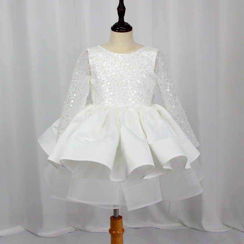 Детское платье AliExpress, белое, с длинными рукавами, кружевное, с пайетками, для выступлений, свадебное платье для маленьких девочек, на день рождения