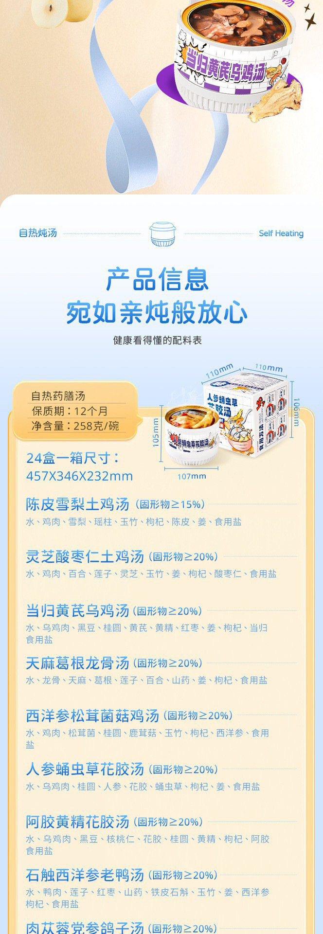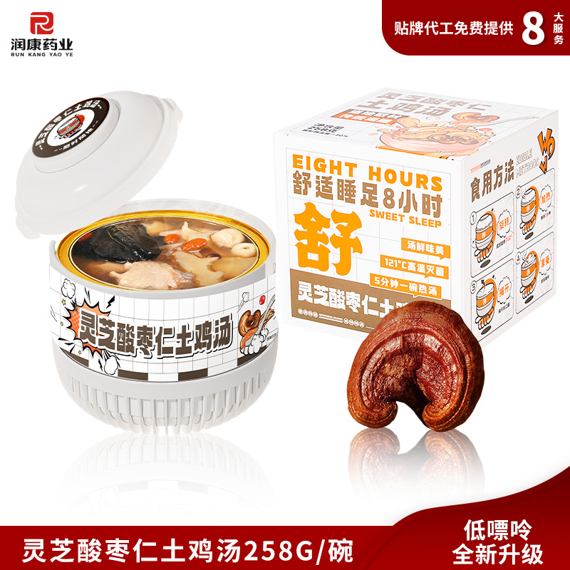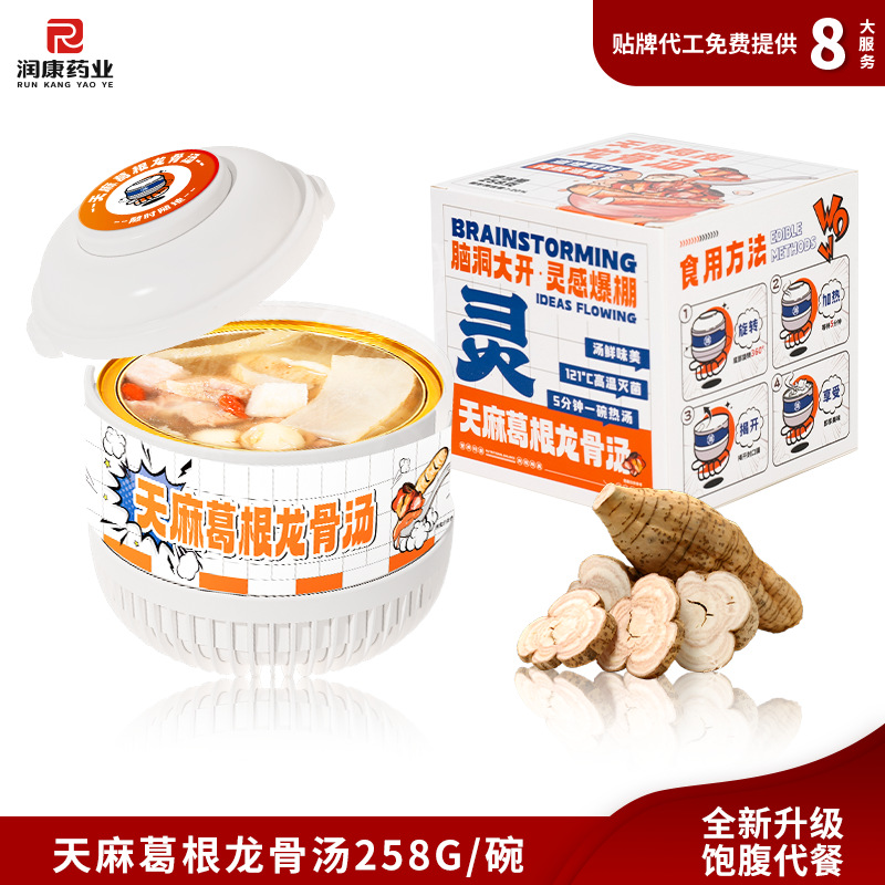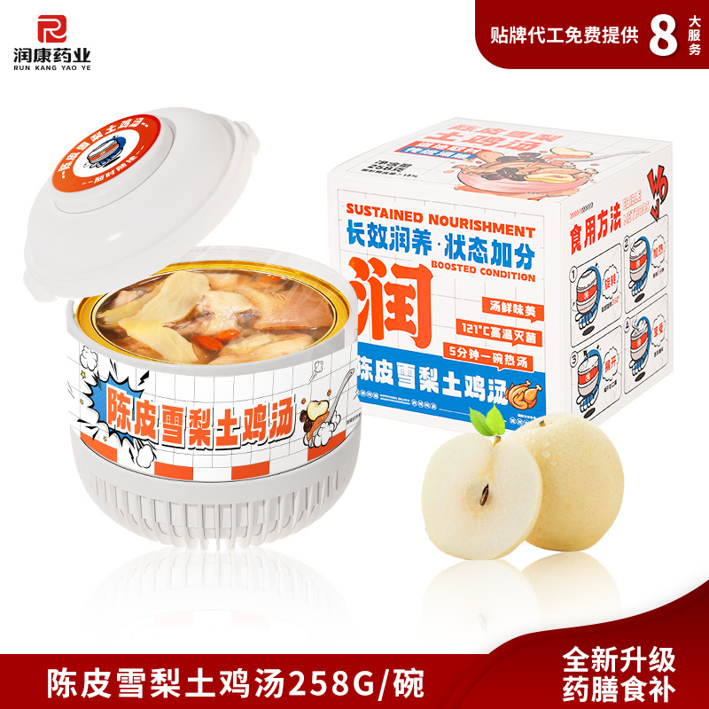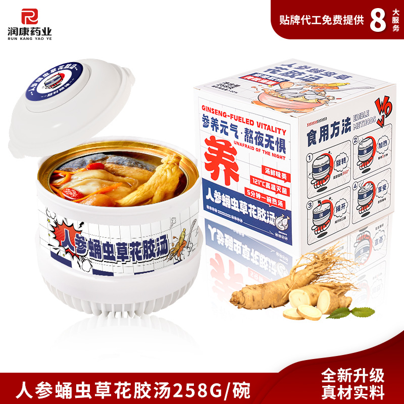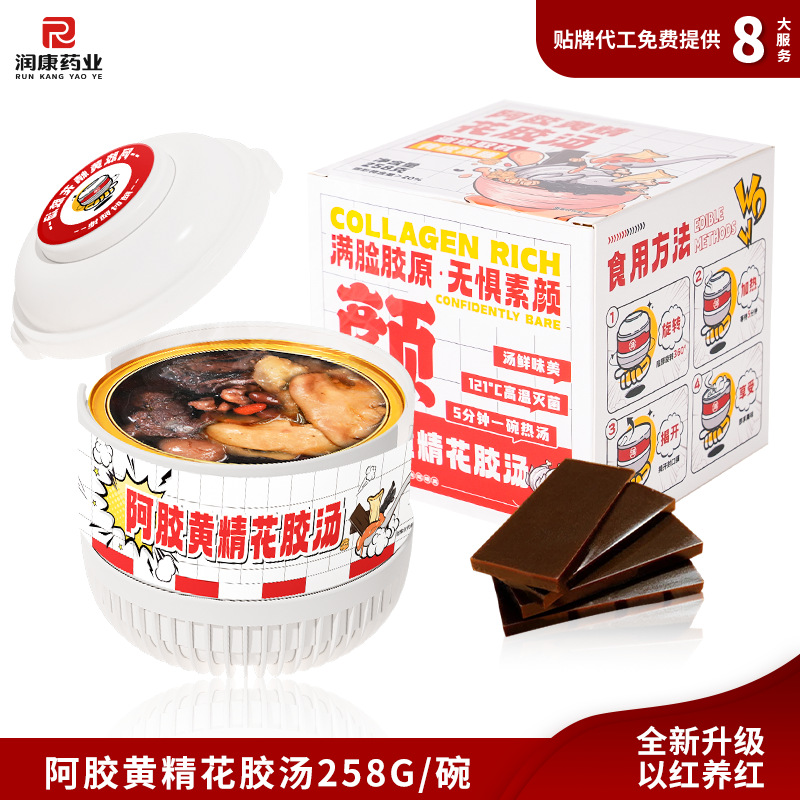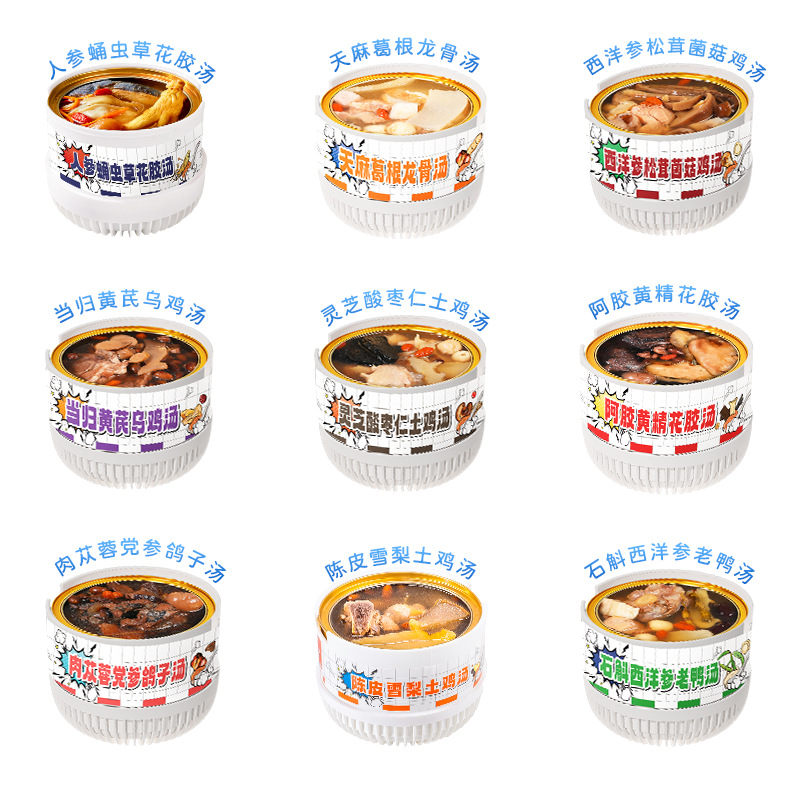 Желатин из ослиной кожи, суп из полигонатума и рыбьей пасти 258 г/коробка; Мандариновая цедра, груша и куриный суп 258 г/уп.; Суп из гастродии, пуэрарии и косточки дракона, 258 г/упаковка; Суп из голубей с добавлением Cistanche deserticola и Codonopsis pilosula, 258 г/упаковка; Суп с куриной ножкой, рейши и ядрами жужубе, 258 г/упаковка; Суп из гуся с дендробиумом и американским женьшенем, 258 г/упаковка; Суп с цветками женьшеня и кордицепса, 258 г/упаковка
