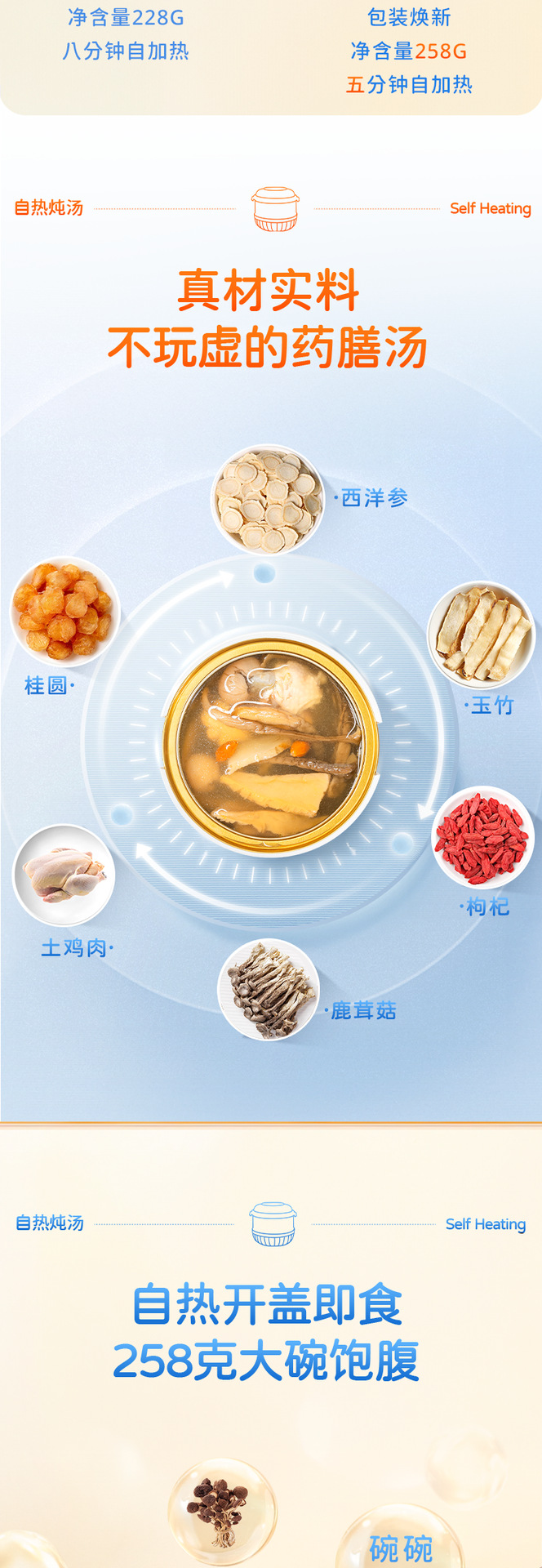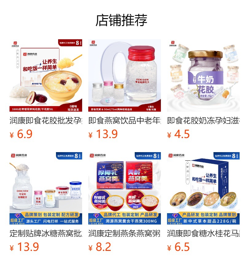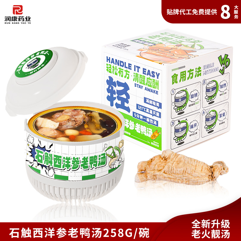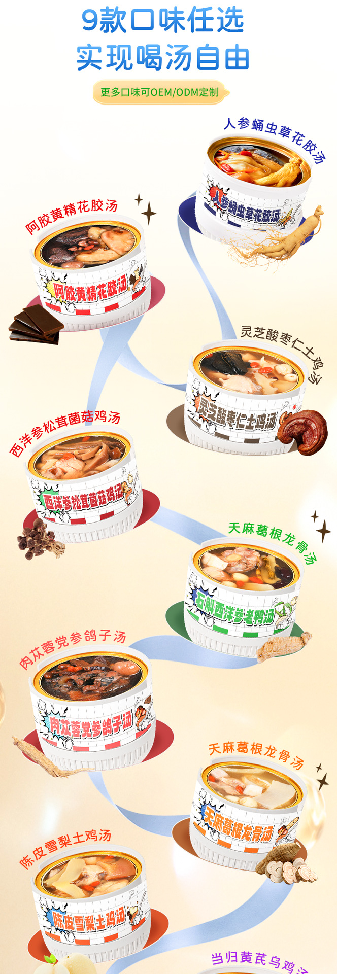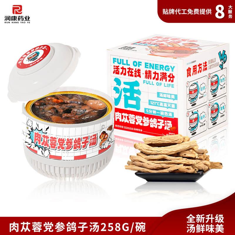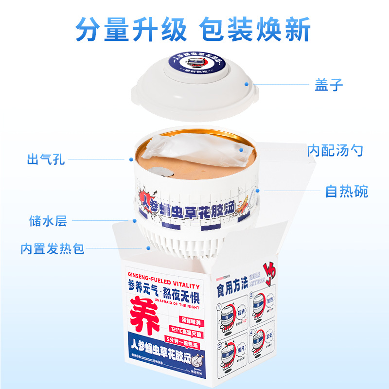 Желатин из ослиной кожи, суп из полигонатума и рыбьей пасти 258 г/коробка; Мандариновая цедра, груша и куриный суп 258 г/уп.; Суп из гастродии, пуэрарии и косточки дракона, 258 г/упаковка; Суп из голубей с добавлением Cistanche deserticola и Codonopsis pilosula, 258 г/упаковка; Суп с куриной ножкой, рейши и ядрами жужубе, 258 г/упаковка; Суп из гуся с дендробиумом и американским женьшенем, 258 г/упаковка; Суп с цветками женьшеня и кордицепса, 258 г/упаковка