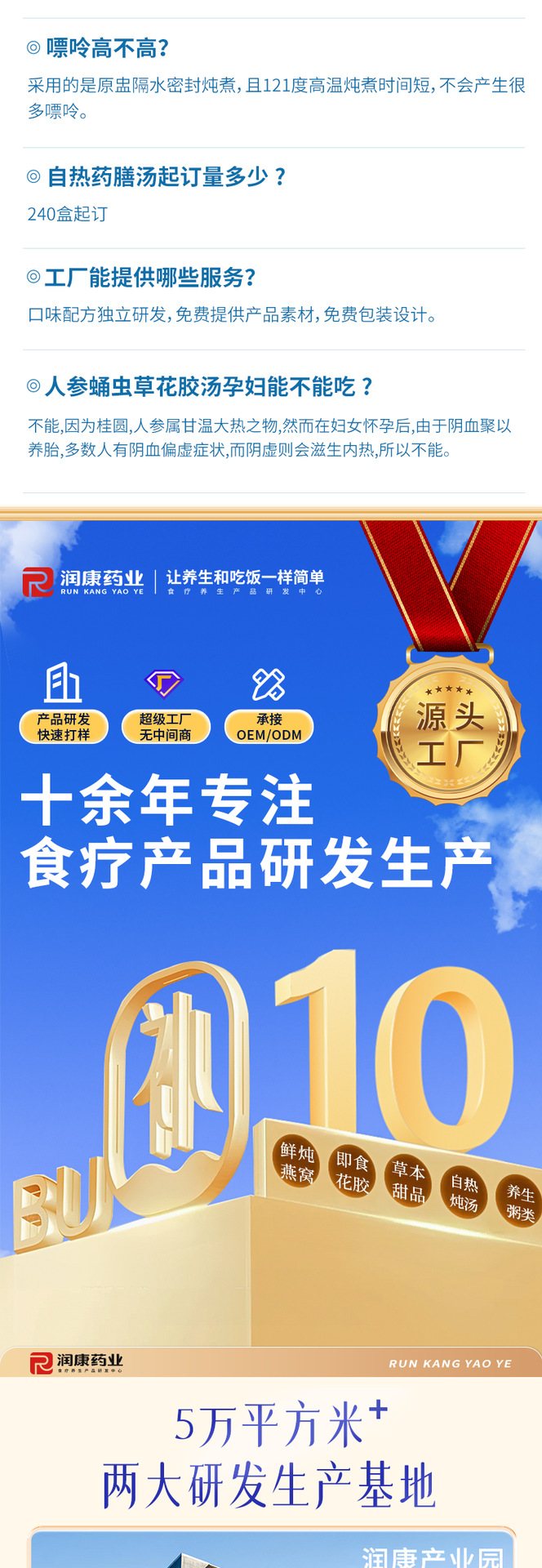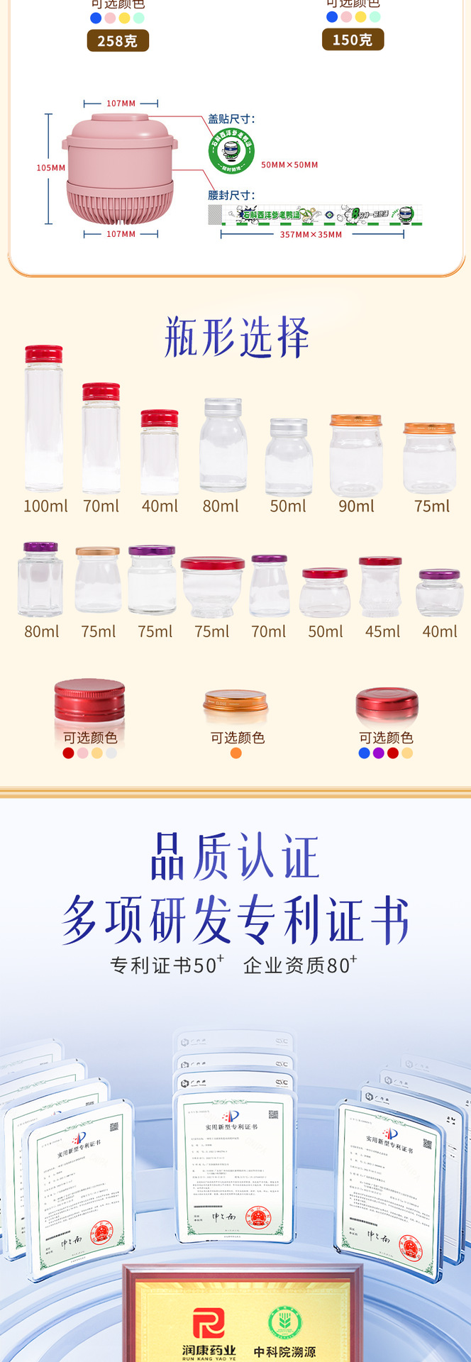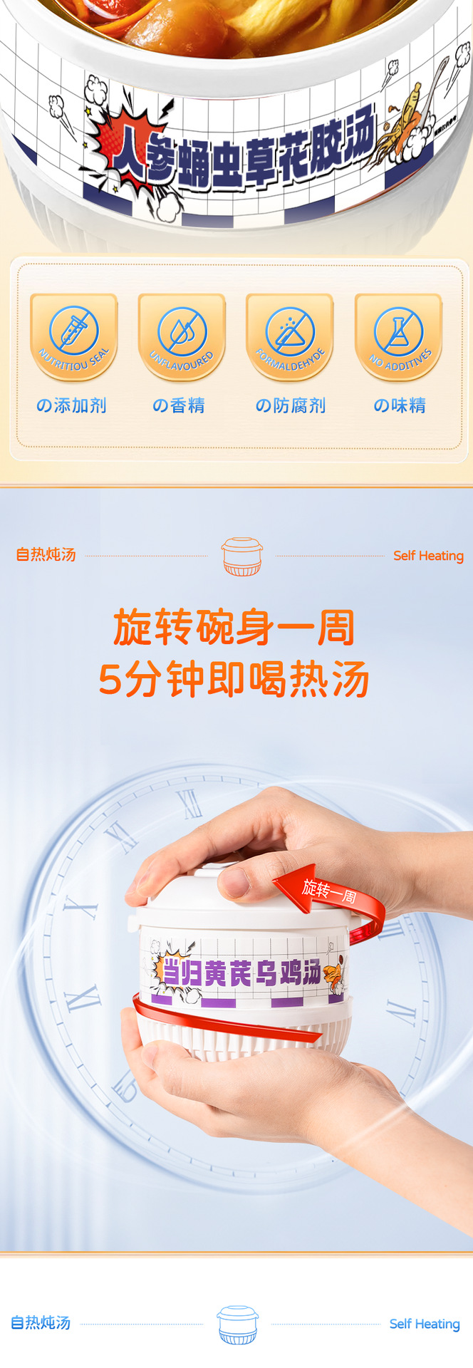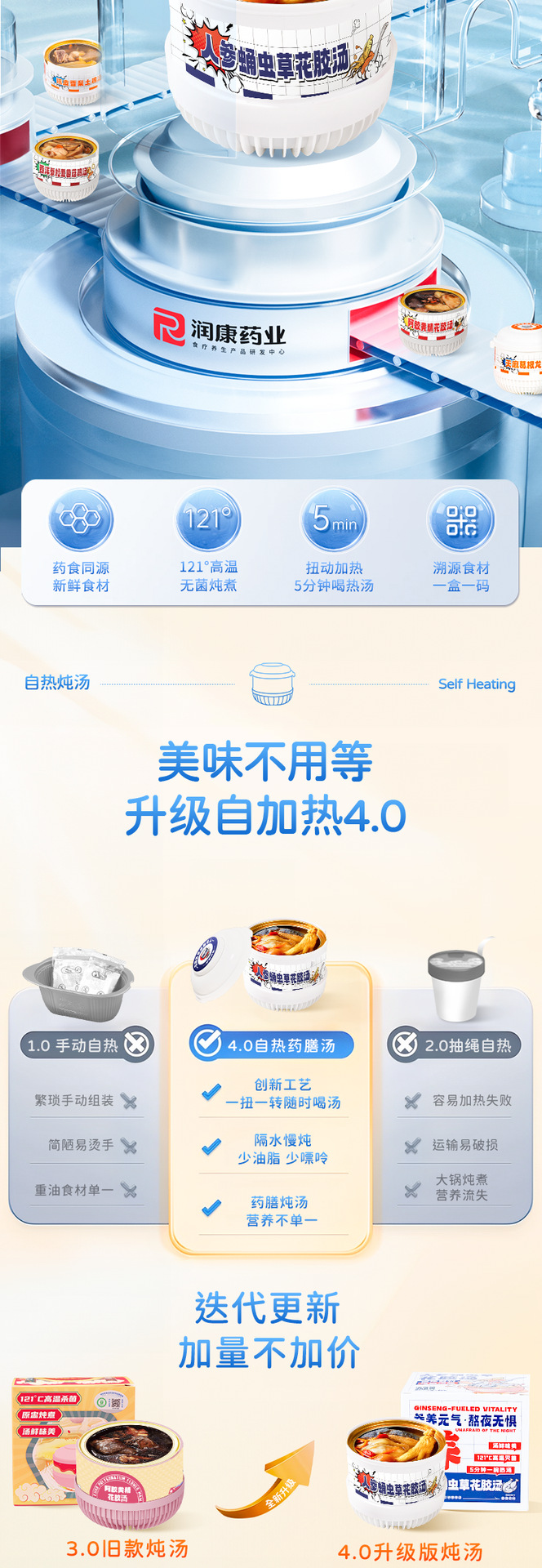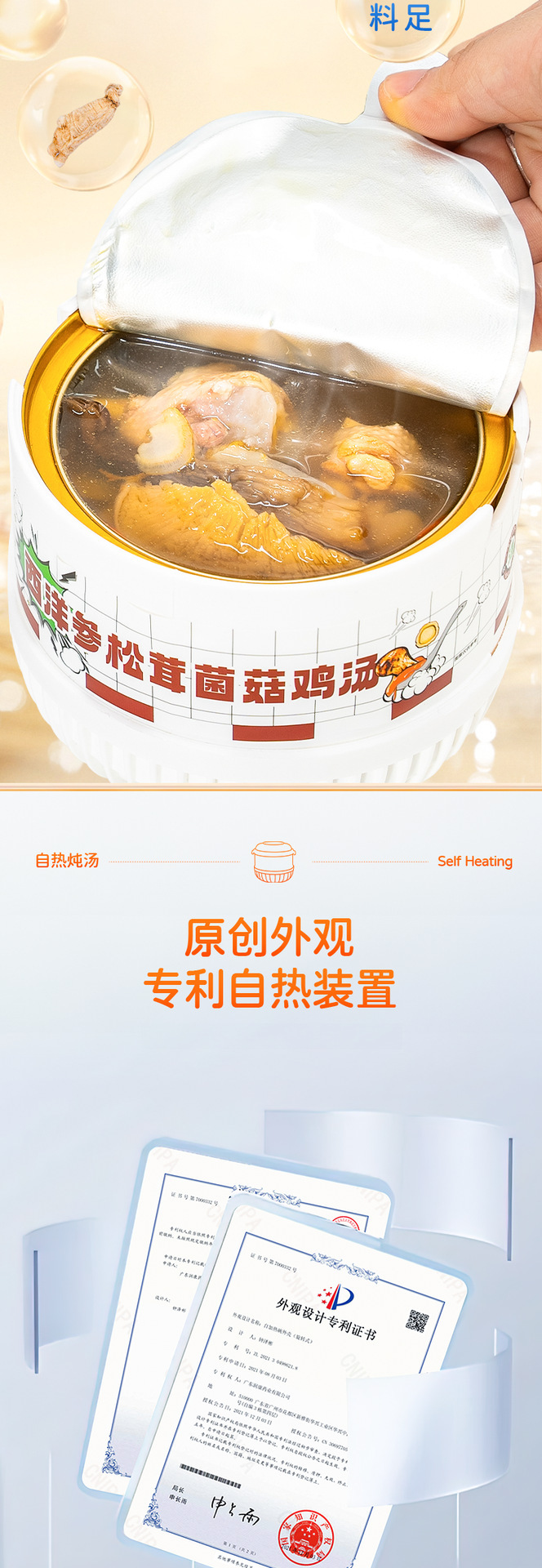 Желатин из ослиной кожи, суп из полигонатума и рыбьей пасти 258 г/коробка; Мандариновая цедра, груша и куриный суп 258 г/уп.; Суп из гастродии, пуэрарии и косточки дракона, 258 г/упаковка; Суп из голубей с добавлением Cistanche deserticola и Codonopsis pilosula, 258 г/упаковка; Суп с куриной ножкой, рейши и ядрами жужубе, 258 г/упаковка; Суп из гуся с дендробиумом и американским женьшенем, 258 г/упаковка; Суп с цветками женьшеня и кордицепса, 258 г/упаковка