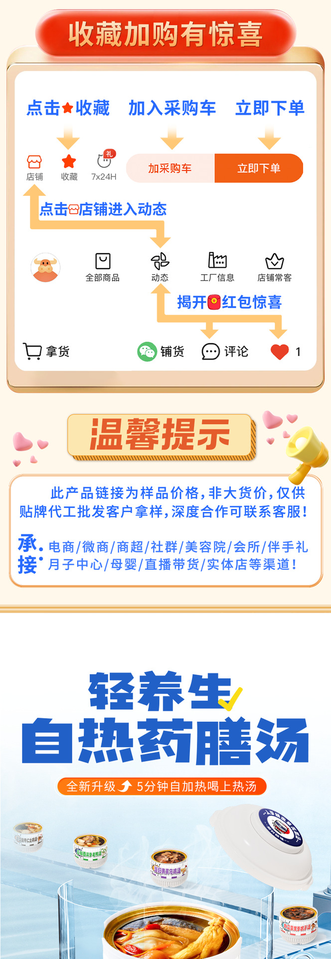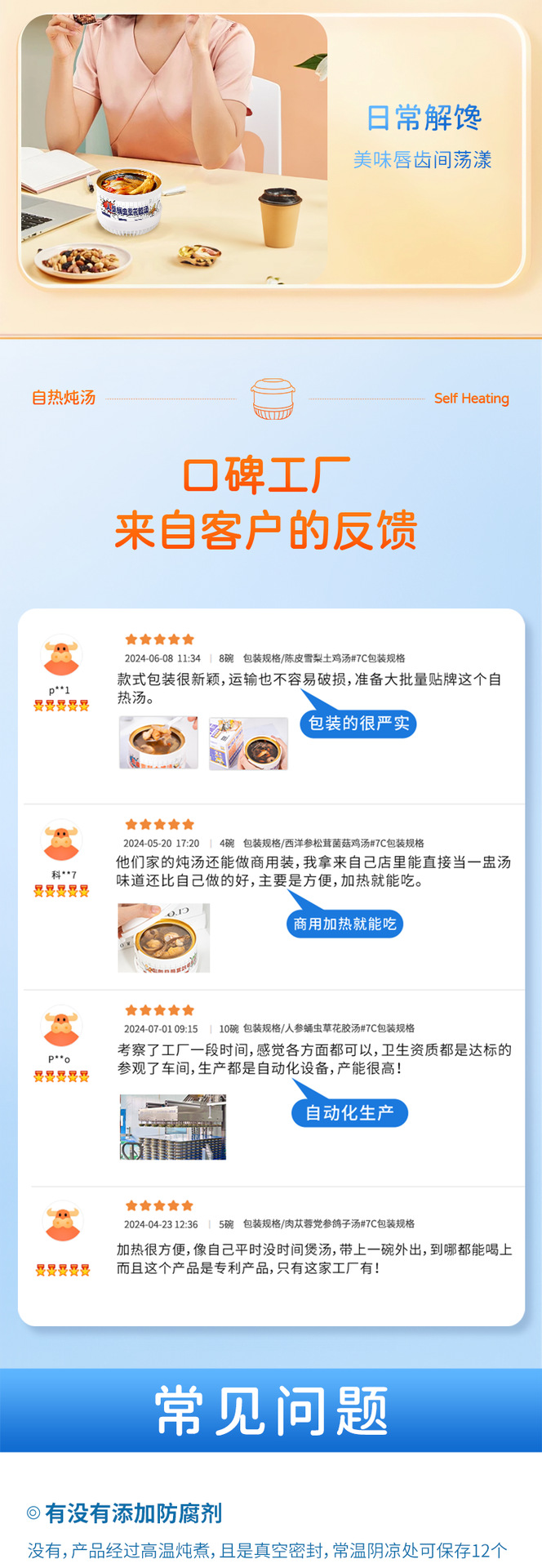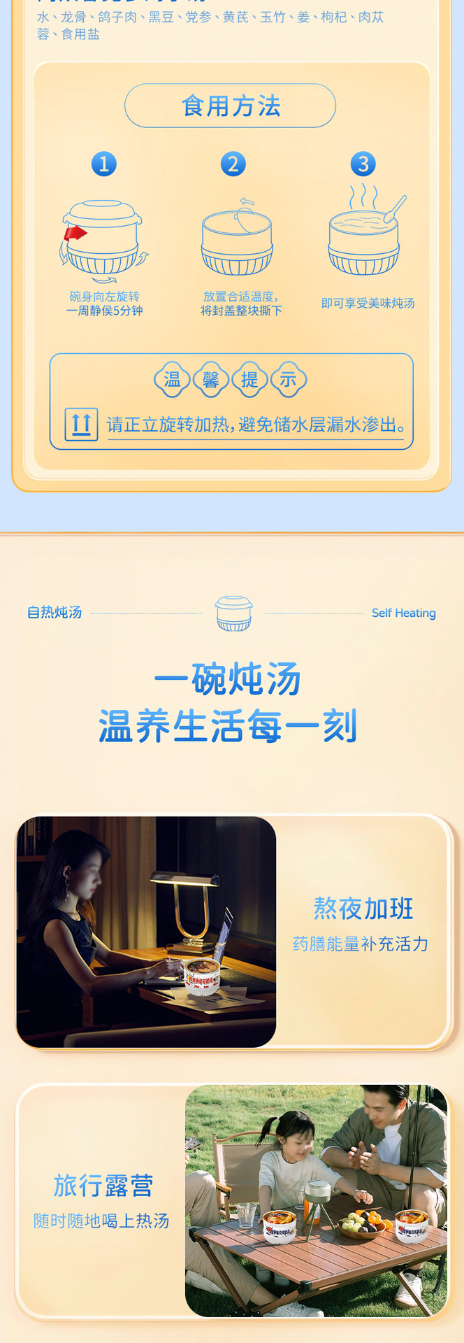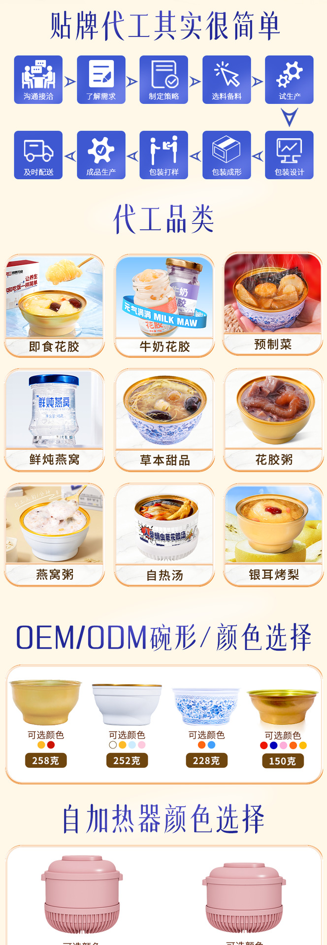 Желатин из ослиной кожи, суп из полигонатума и рыбьей пасти 258 г/коробка; Мандариновая цедра, груша и куриный суп 258 г/уп.; Суп из гастродии, пуэрарии и косточки дракона, 258 г/упаковка; Суп из голубей с добавлением Cistanche deserticola и Codonopsis pilosula, 258 г/упаковка; Суп с куриной ножкой, рейши и ядрами жужубе, 258 г/упаковка; Суп из гуся с дендробиумом и американским женьшенем, 258 г/упаковка; Суп с цветками женьшеня и кордицепса, 258 г/упаковка