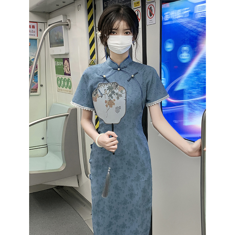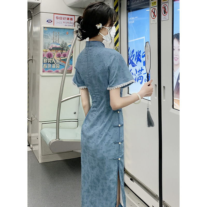 Летний новый синий улучшенный Чонсам в стиле знаменитостей, улучшенная эрозия длинных костей, высококачественный темперамент для молодых девушек, повседневный