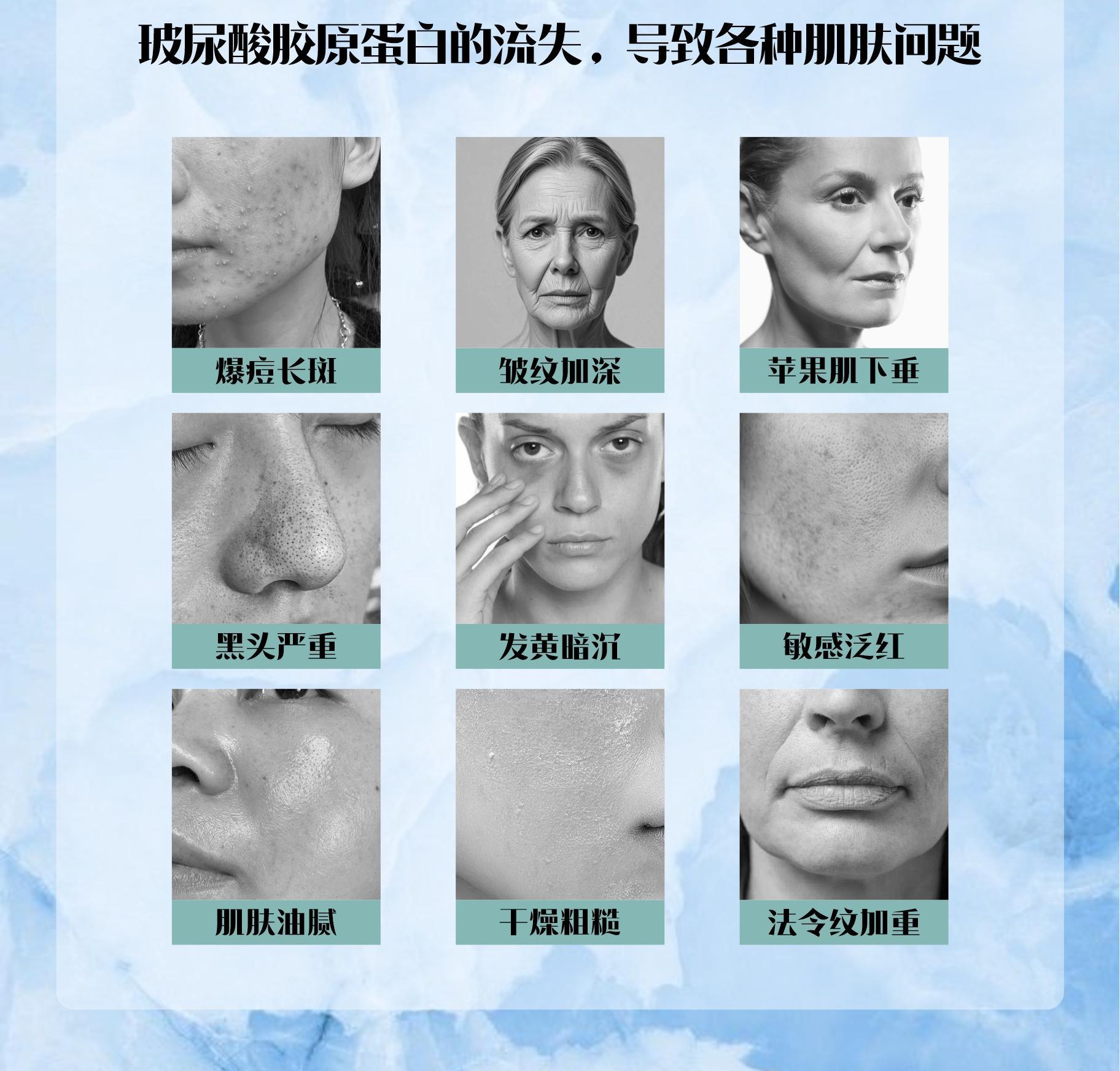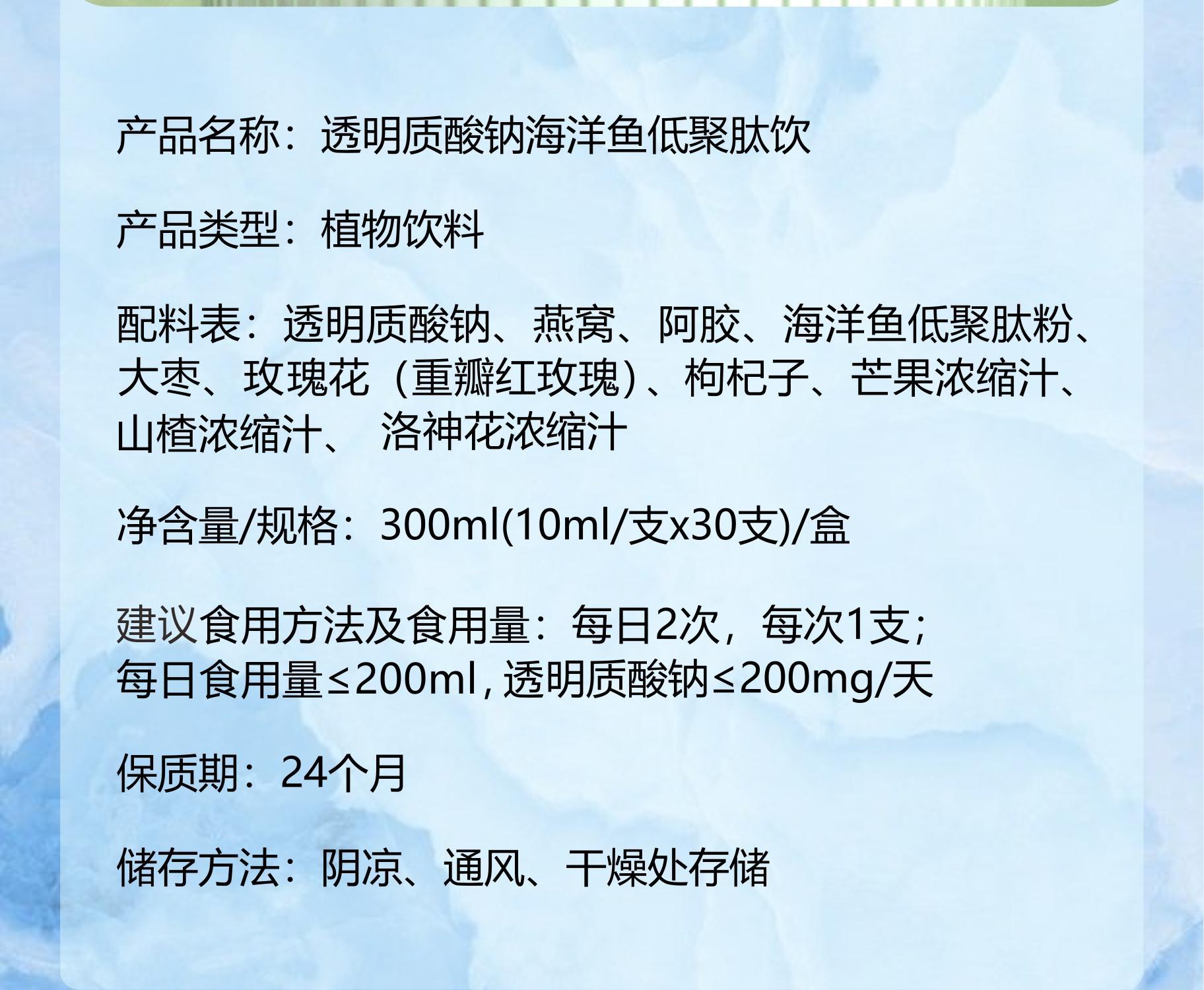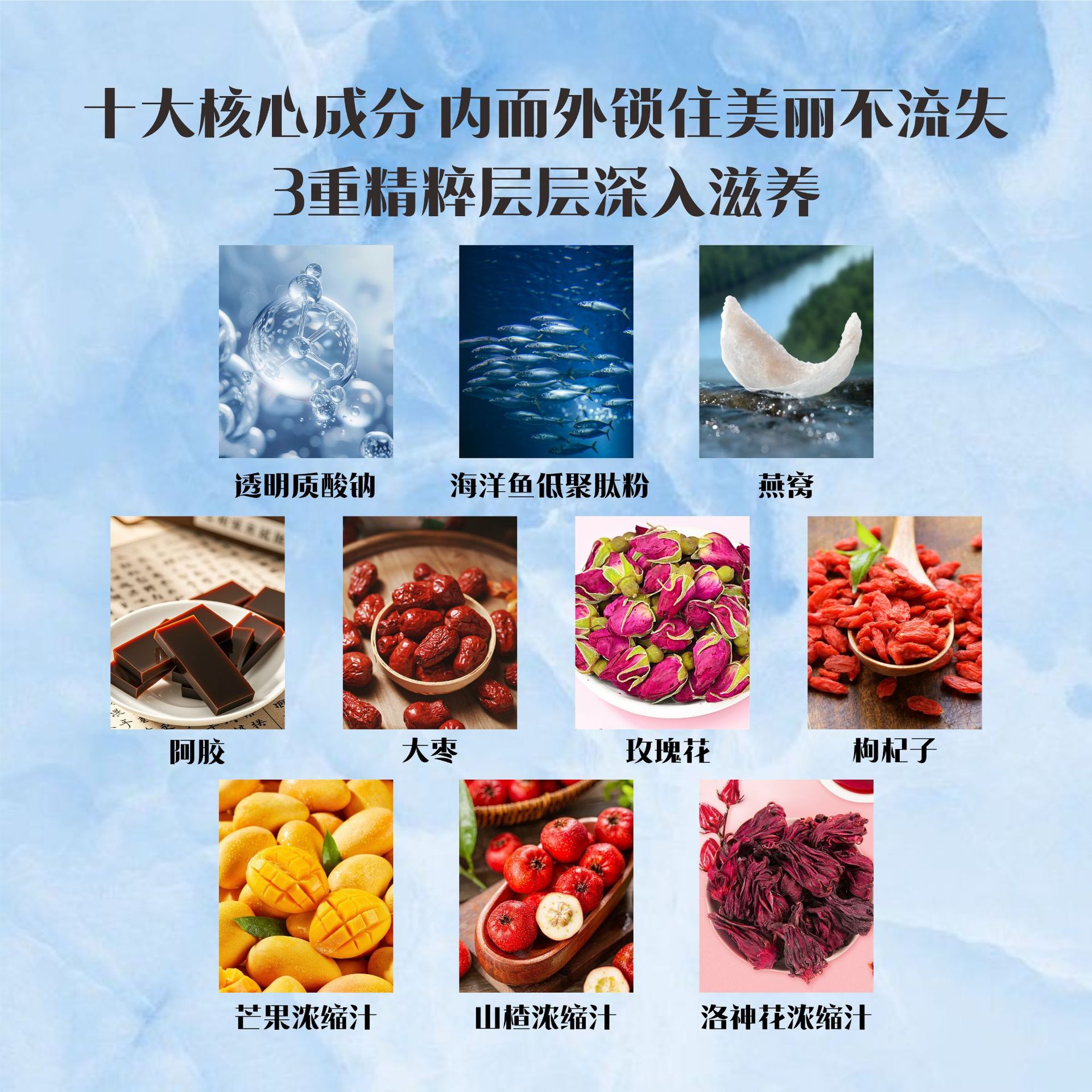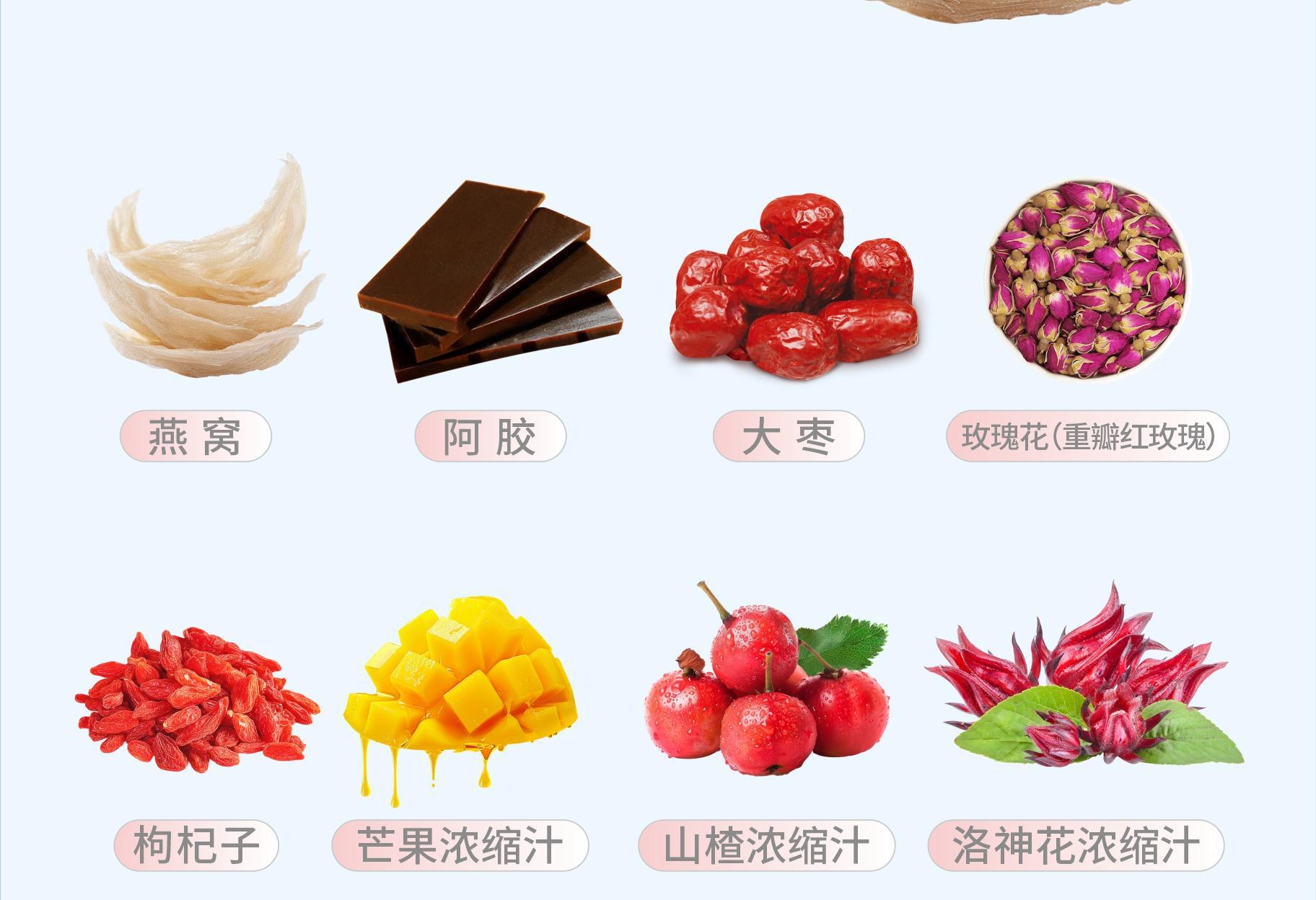 Гиалуронат натрия, олигопептид морских рыб, птичье гнездо, желатин из осины, зизифус, роза, волчья ягода.