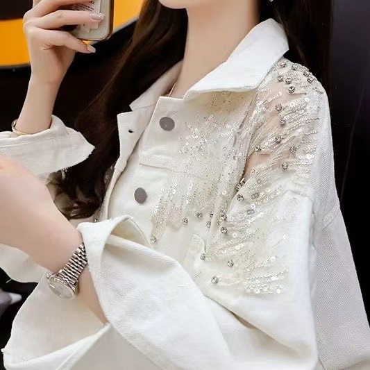 Женская джинсовая куртка, укороченная модель, уникальный дизайн, повседневная, износостойкая, с сетчатым верхом со стразами, европейский стиль весна-осень 2025.