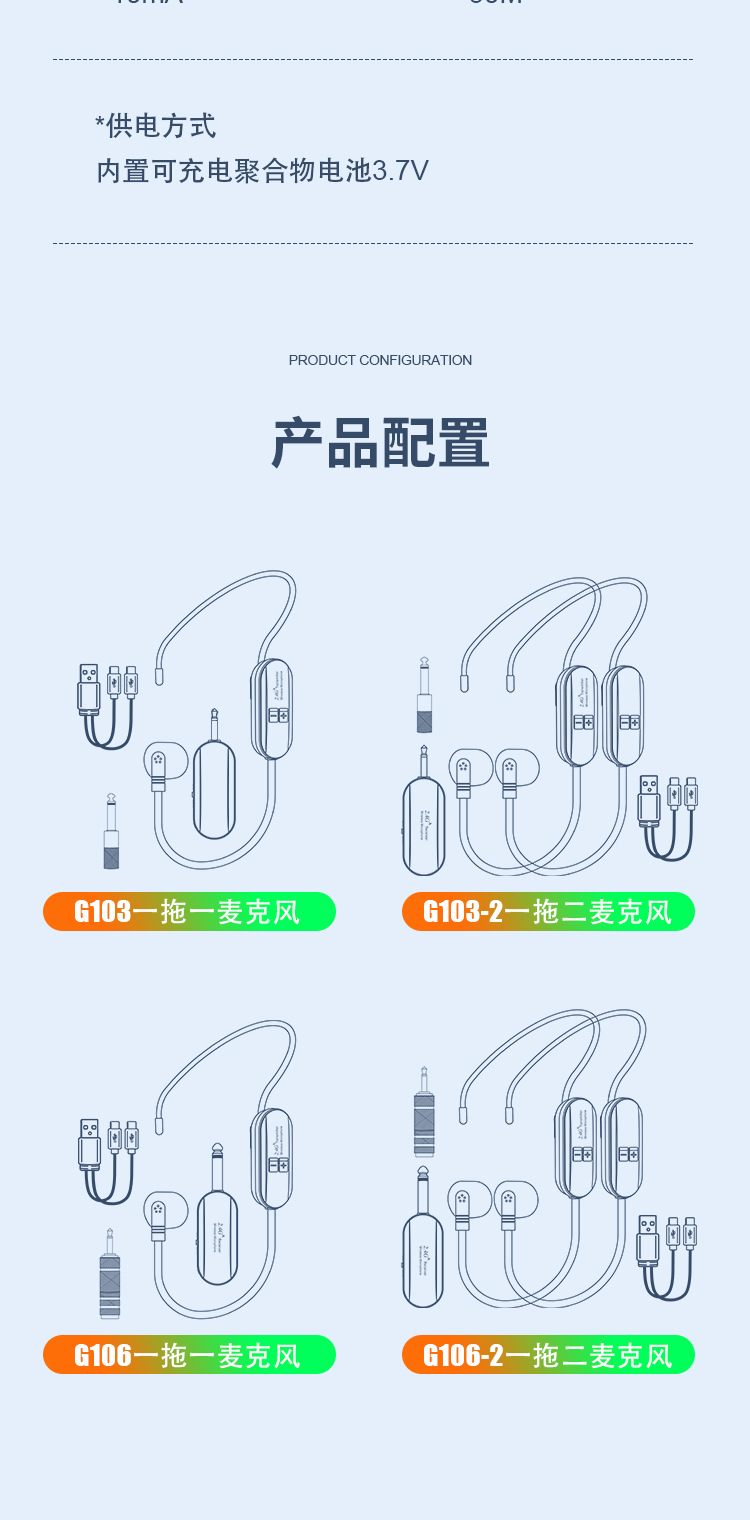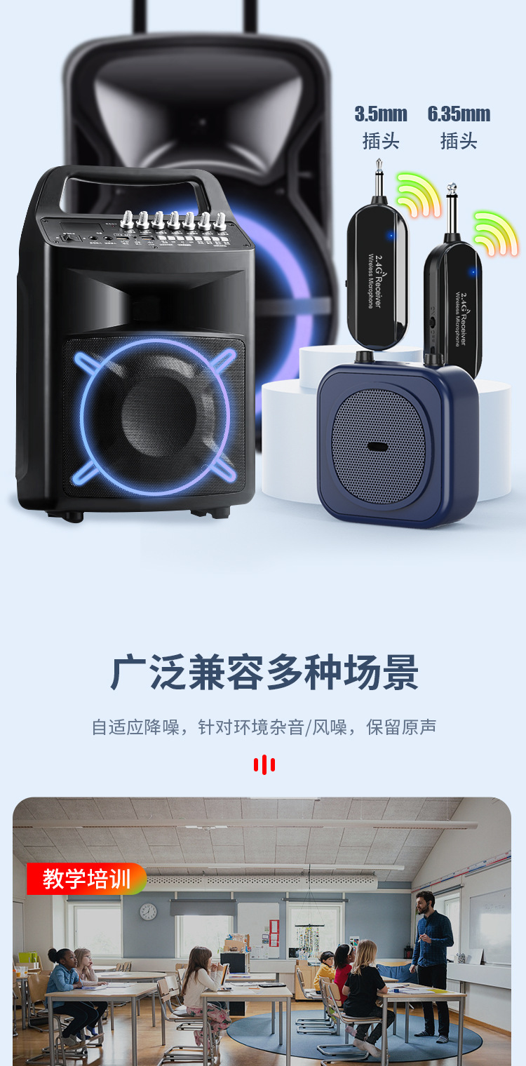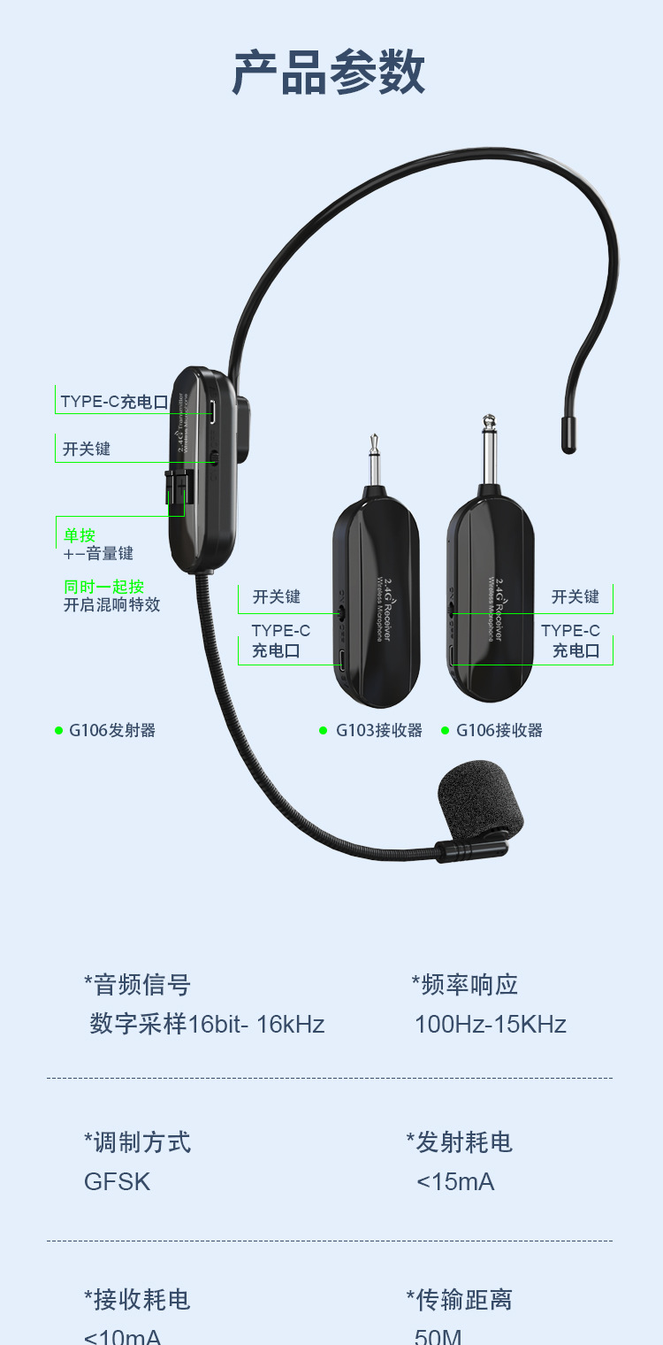 Один беспроводной головной микрофон 2,4 г (интерфейс 3,5 мм); Один беспроводной головной микрофон 2,4 г (интерфейс 6,35 мм); Один на два беспроводных головного микрофона 2,4 г (интерфейс 6,35 мм)