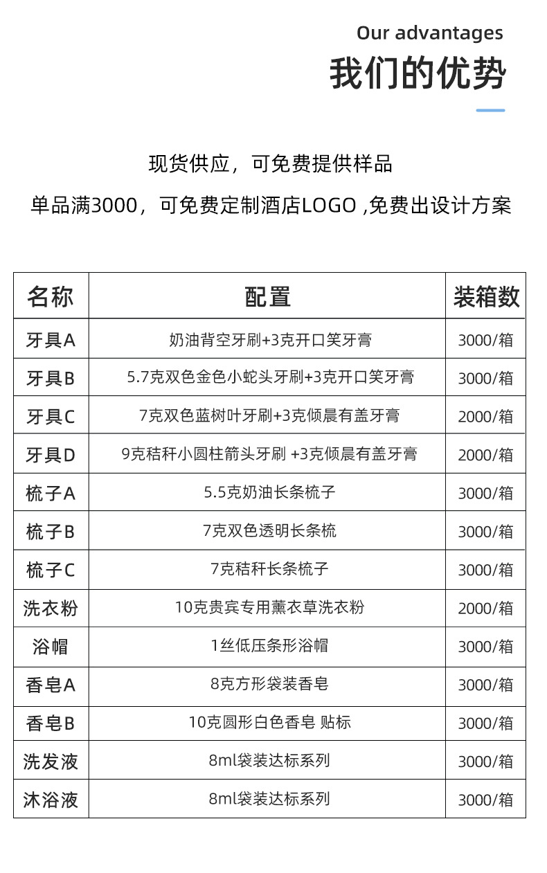 Зубной набор + (5 г щетина акриловая спинка пустая зубная щетка плюс 3 г открытый рот Смайл зубная паста); Зубной набор B(6 г Small Snake Head Toothbrush с мягкой щетиной Toothbrush Plus 3 г Open Mouth Smile Toothpaste); Зубной Набор C(7 г Double Color Leaf Soft Hair Plus 3 г Tianchen Toothpaste); Зубной набор D(9 г соломенная зубная щетка Gray Silk Plus 3 г Tianchen Toothpaste); Расческа 5-ти (5,5 г кремовый длинный гребень); Расческа B(7 г двухцветная прозрачная длинная расческа); Расческа C(7 г соломенная длинная расческа); Стиральный порошок (10 г лавандового стирального порошка); Шапочка для душа (1 проволочная шапочка низкого давления); Мыло А (8 г квадратный пакет мыла); Мыло B(10 г Круглое Белое мыло с этикеткой); Шампунь (серия пакета 8 мл стандартная новых и старых стилей случайных); Жидкость для ванны (стандартная серия пакетов 8 мл новых и старых стилей случайных)