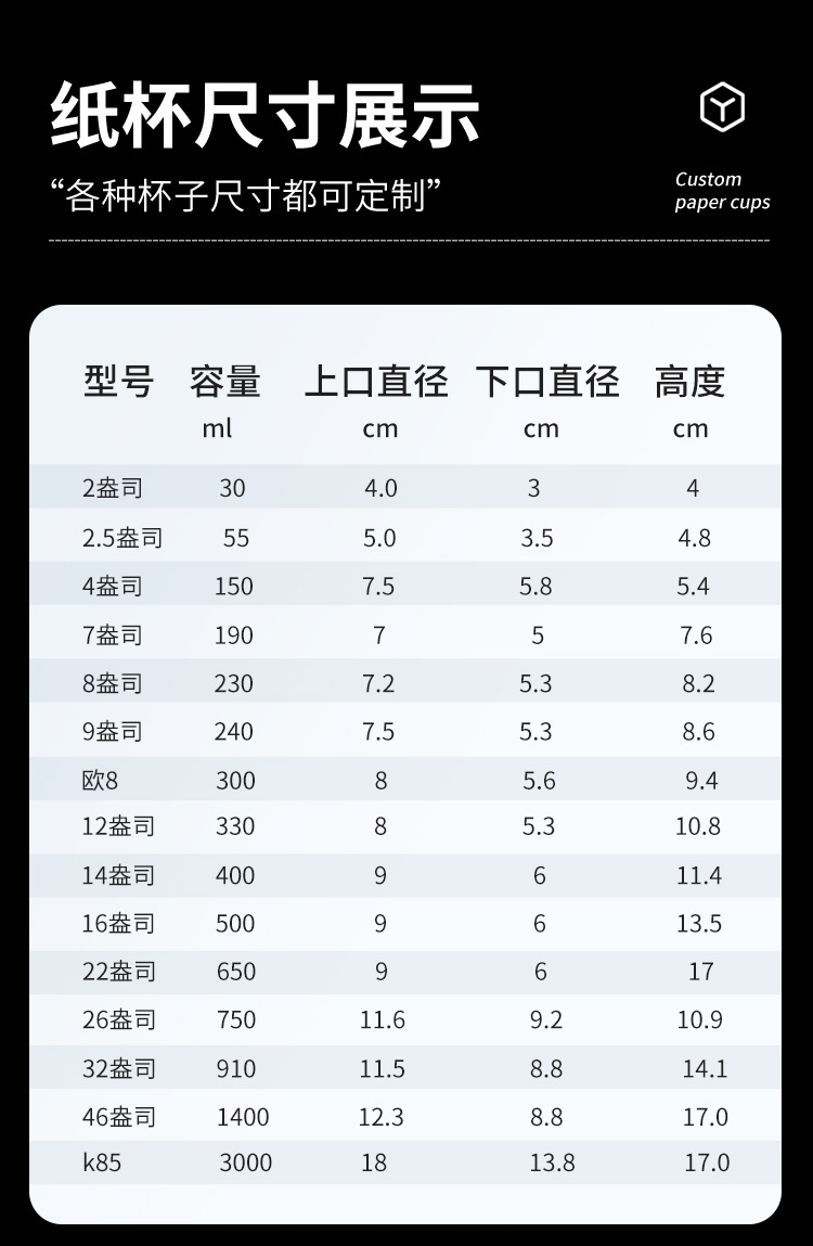 9 унций, 250 мл, утолщенный и индивидуальный [подходит для домашнего использования], начиная с 1000 штук; 9 унций, 250 мл, очень густой, по индивидуальному заказу [подходит для магазинов], начиная от 1000 штук; 9 унций, 250 мл, очень густой, по индивидуальному заказу [подходит для предприятий], начиная от 1000 штук; 9 унций, 250 мл, бамбуковое волокно, натуральный цвет, очень густой [по индивидуальному заказу], от 20k штук; 7 унций, 190 мл, очень густой [по индивидуальному заказу], начиная с 30k; Утолщенный бумажный стаканчик на 8 унций, 230 мл [по индивидуальному заказу], начиная с 30k шт.; Кофейный стаканчик из плотной бумаги евро 8 300мл [на заказ] от 10k шт.; Европейский 8, 300 мл, утолщенный двухслойный бумажный стаканчик [по индивидуальному заказу] от 10k штук; Утолщенный бумажный стаканчик на 12 унций, 330 мл [по индивидуальному заказу], начиная с 10k штук; Утолщенный бумажный стаканчик на 14 унций, 400 мл [по индивидуальному заказу], начиная с 10k штук; Утолщенный двухслойный бумажный стаканчик на 14 унций, 400 мл [по индивидуальному заказу], начиная с 10k штук; Утолщенный бумажный стаканчик на 16 унций, 500 мл [по индивидуальному заказу], начиная с 10k штук; Утолщенный двухслойный бумажный стаканчик на <16 унций, 500 мл [по индивидуальному заказу], начиная с 10k штук; 22A, 32A, 46A, ведро для шампуров K85, ведро для попкорна могут быть изготовлены по индивидуальному заказу.