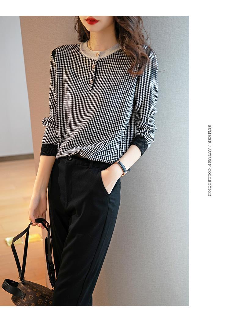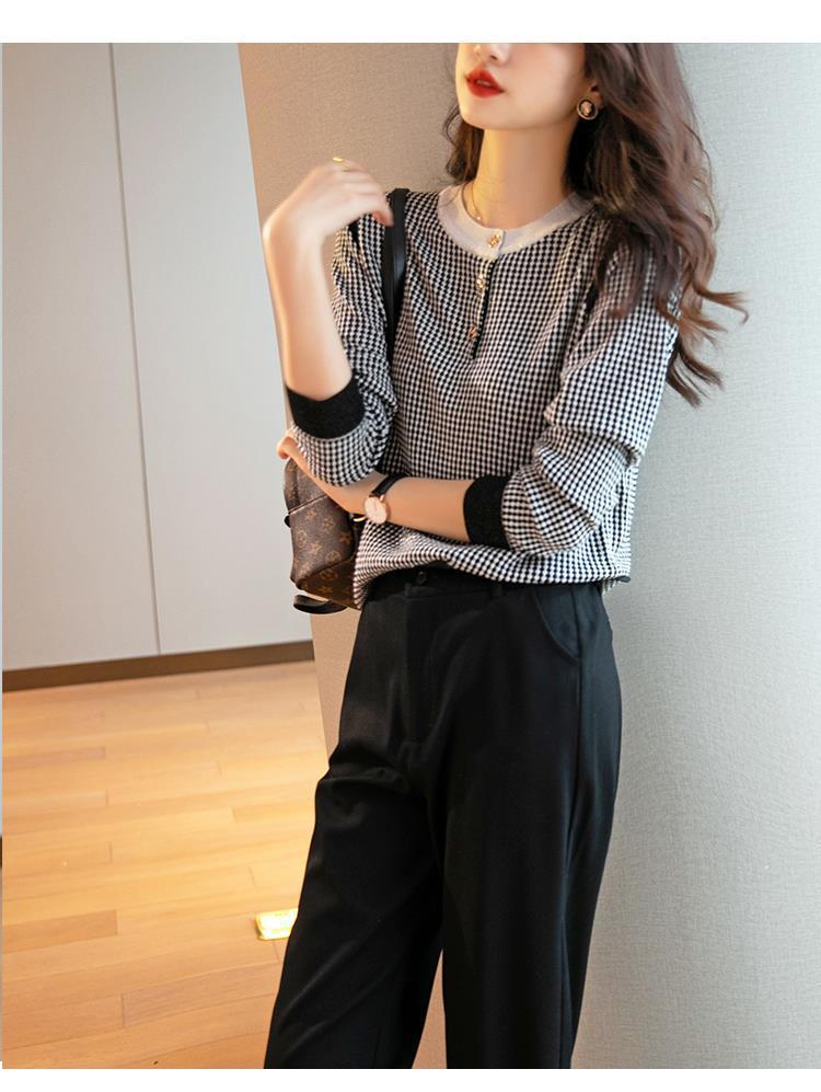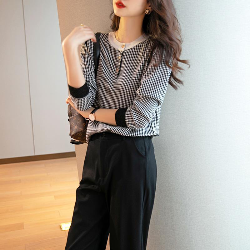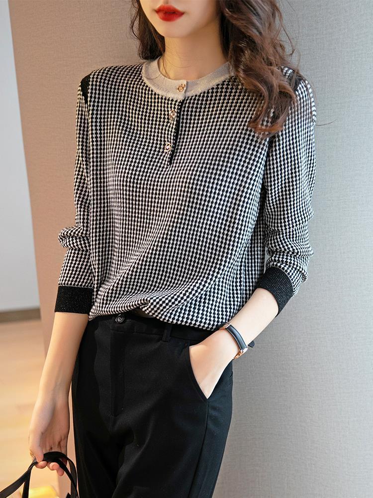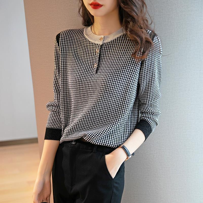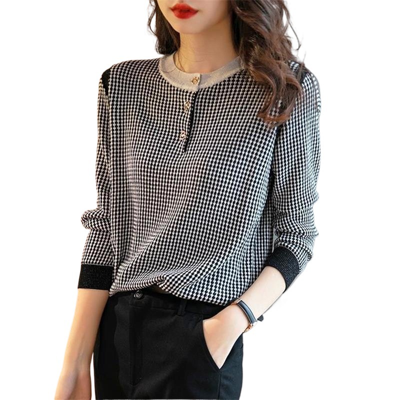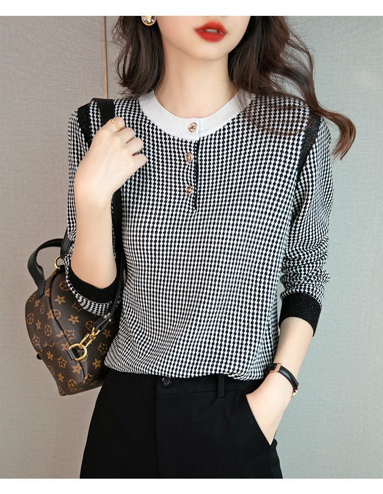 Приятный для кожи дышащий Осенний Топ, Женская Новинка 2022 года, свободный короткий свитер в западном стиле с длинными рукавами, черно-белая вязаная рубашка в клетку
