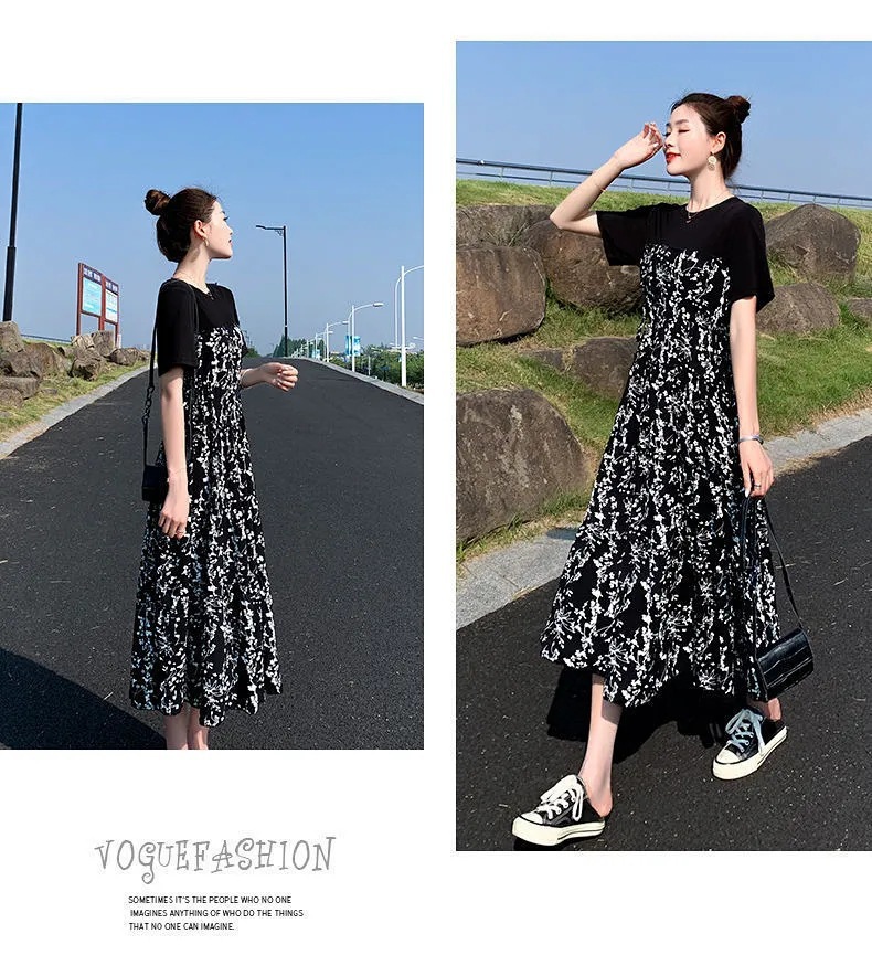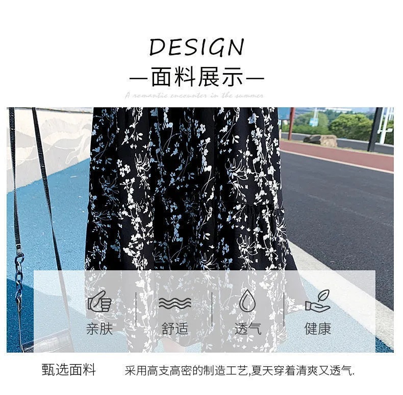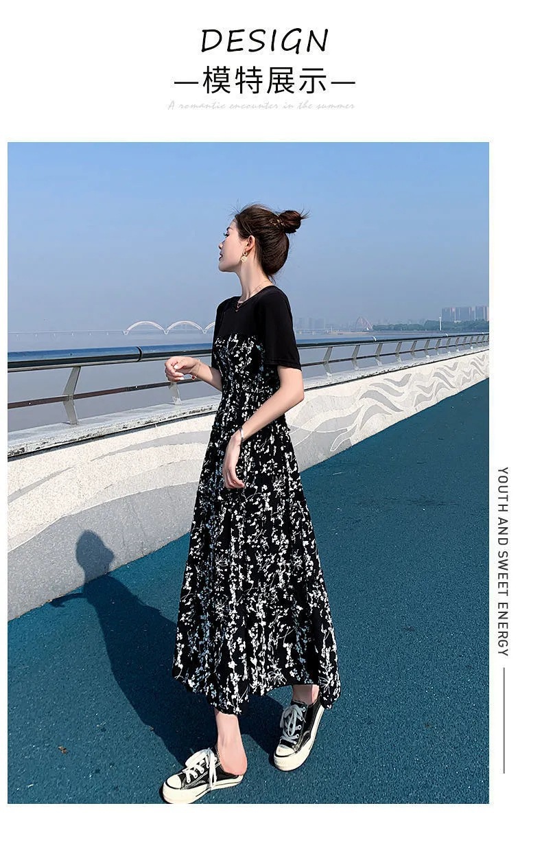 Платье для женщин 2025 лето новый стиль в стиле Хепберн, миди-юбка с цветочным принтом, элегантная высокая талия, стройная, с короткими рукавами, длинная юбка