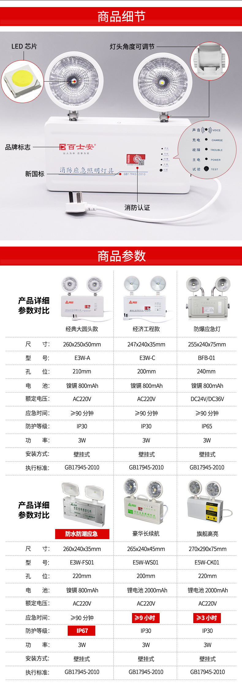 Специальная цена национального стандарта [90 минут]; Инженерная экономика [180 минут]; Роскошный стиль с круглой головой [90 минут]; Флагманская модель 90 минут [линия 1,2 млн]; Флагманская модель 120 минут [линия 1,2 млн]; Флагманская модель 3 часа [линия 1,2 млн]; Флагманская модель 9 часов [линия 1,2 млн]; Модель Supreme 9 часов [универсальная головка]; Экономическая модель национального стандарта (экспорт безопасности); Экономическая модель национального стандарта (лицом влево); Экономическая модель национального стандарта (лицом вправо); Экономическая модель национального стандарта (двусторонняя); Большая новая модель национального стандарта (экспорт безопасности); Большая новая модель национального стандарта (лицом влево); Большая новая модель национального стандарта (лицом вправо); Большая новая модель национального стандарта (двусторонняя); Взрывозащищенное аварийное освещение с двойной головкой; IP67Водонепроницаемый влагостойкий аварийный светильник; IP67 водонепроницаемый и влагостойкий встроенный аварийный светильник