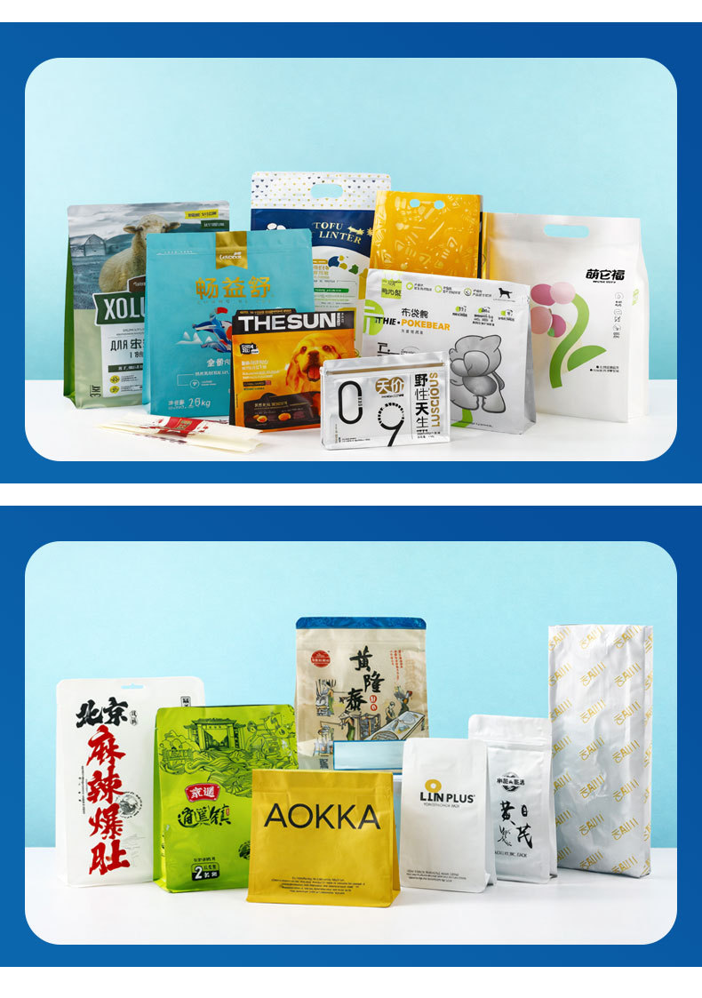 4.提供十余种袋型选择:三边封袋、自立袋、自立拉链袋、八边封袋、背封风琴袋、异形袋、吸嘴袋等适用于冻干食品、坚果、宠粮、零食、干货、粮油等多品类食品包装。