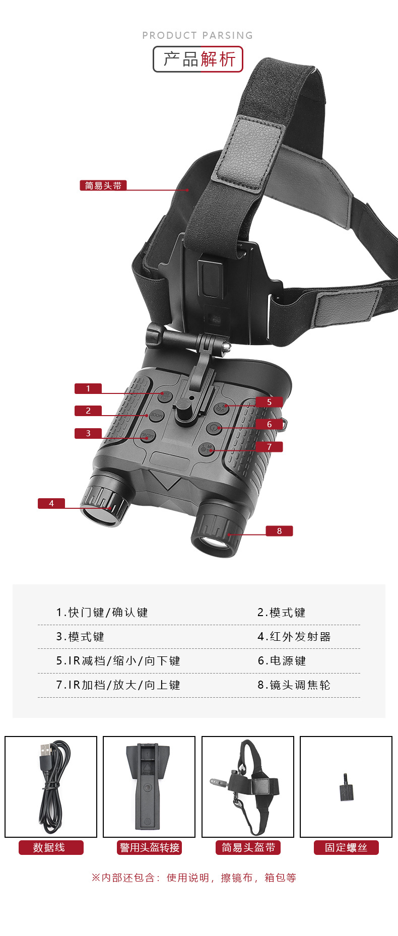 标准包材含:硬包、USB线、背带、内置电池、清洁布、说明书、支架配件、简易头带