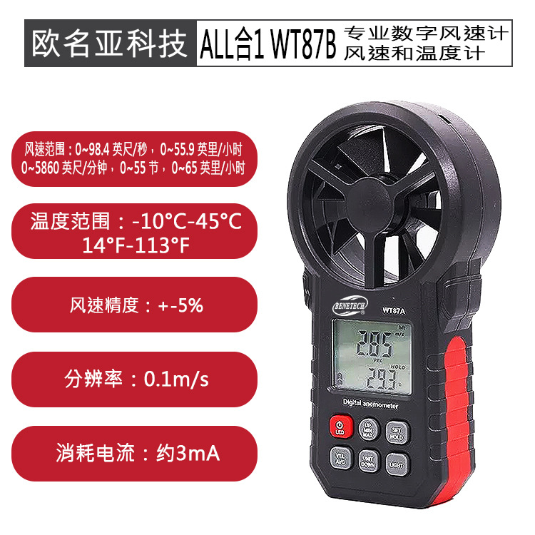 一些功能包括:风速,温度测量,风速单位选择功能,°C/°F单位转换功能,最大/最小风速测量,风冷指示功能,自动关机(无操作按钮,自动。