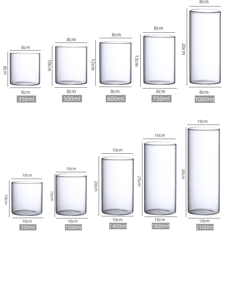 Диаметр 5,5 см * Высота 10 см; 5.5*15; 6.5*8; 6.5*10; 6.5*12; 6.5*15; 6.5*18; 6.5*20; 8*8; 8.5*10; 8.5*12; 8.5*15; 8.5*20; 10*10; 10*12; 10*15; 10*20; 10*25; 10*30; 7*8; 5.5*8