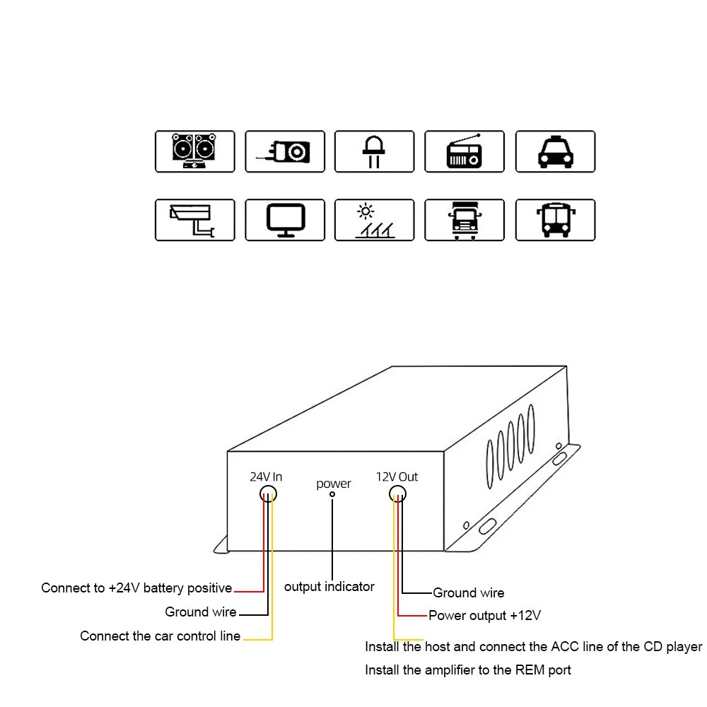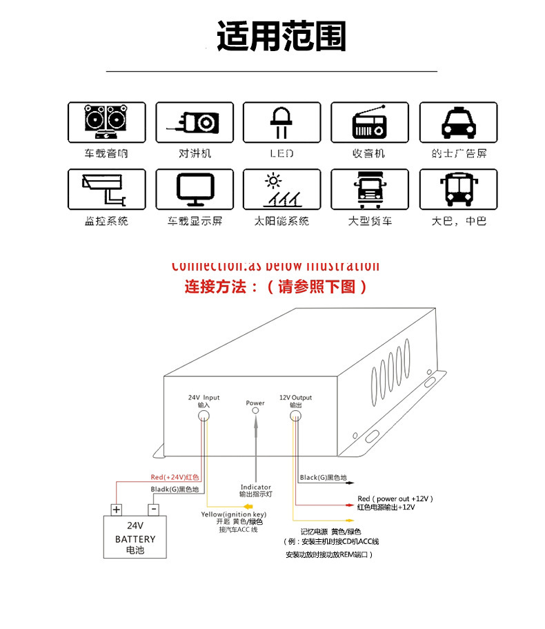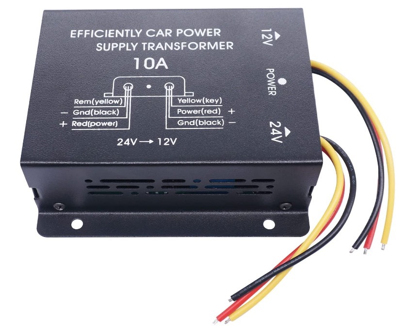 允许您将直流24V电压转换为直流12V电压,以便为可用于24V车辆的12V设备供电,如自动立体声、超低音扬声器、GPS导航器。