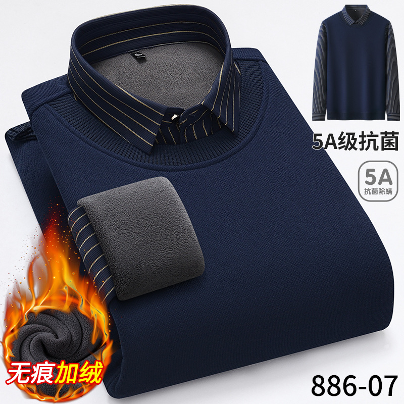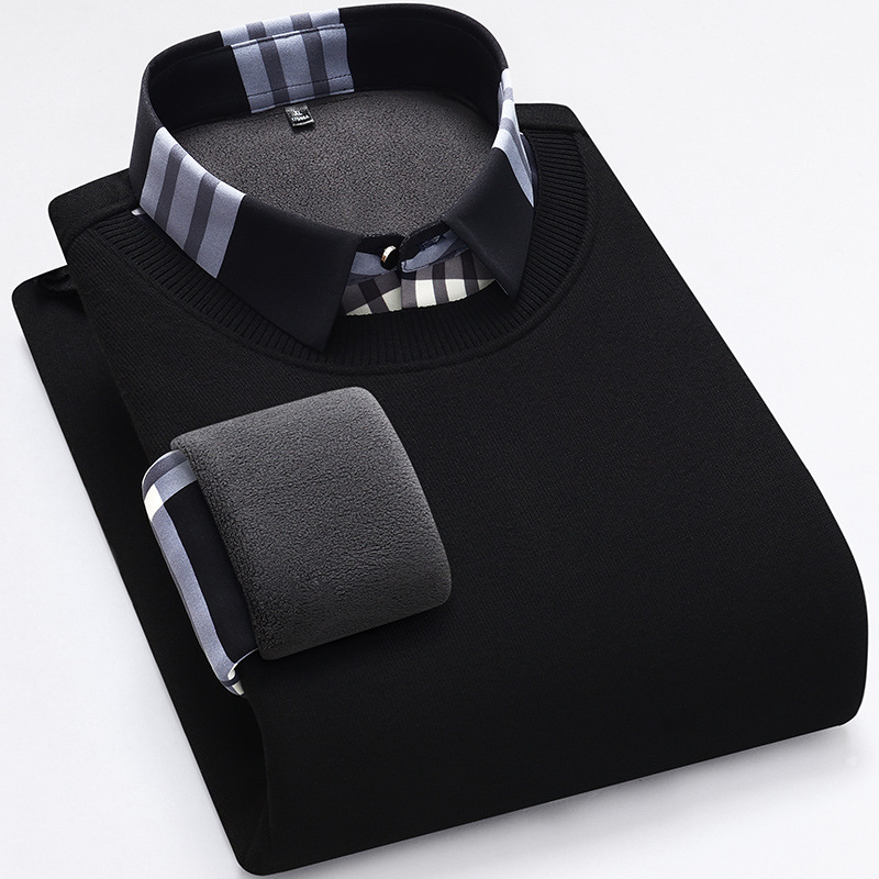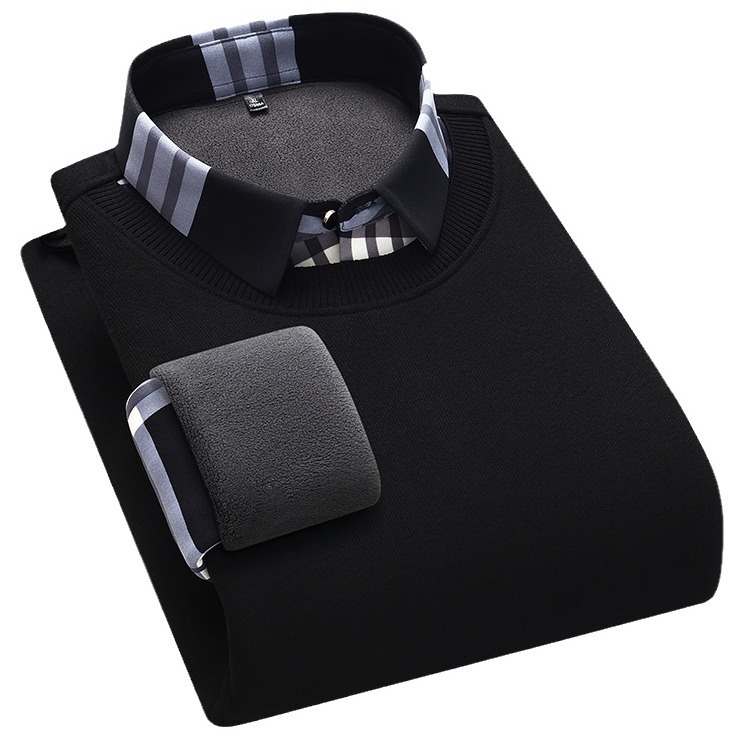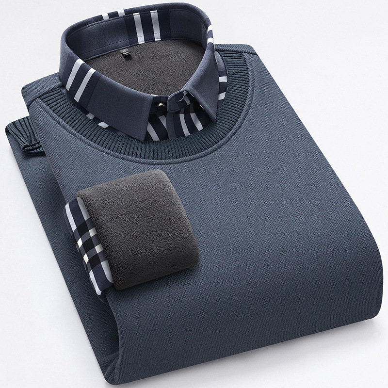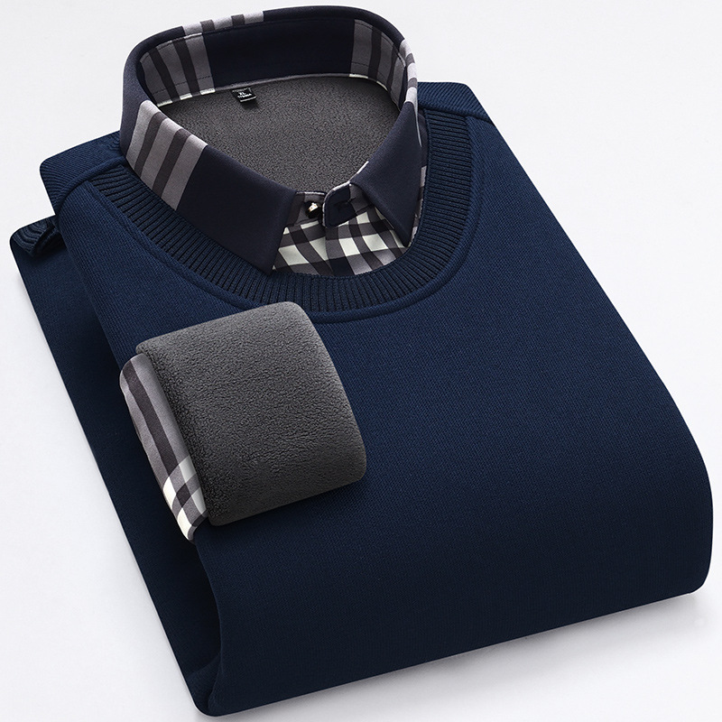 Зимняя мужская утепленная рубашка на флисовой подкладке, имитация двухслойного свитера с круглым вырезом, деловой повседневный теплый трикотаж.