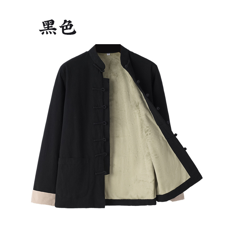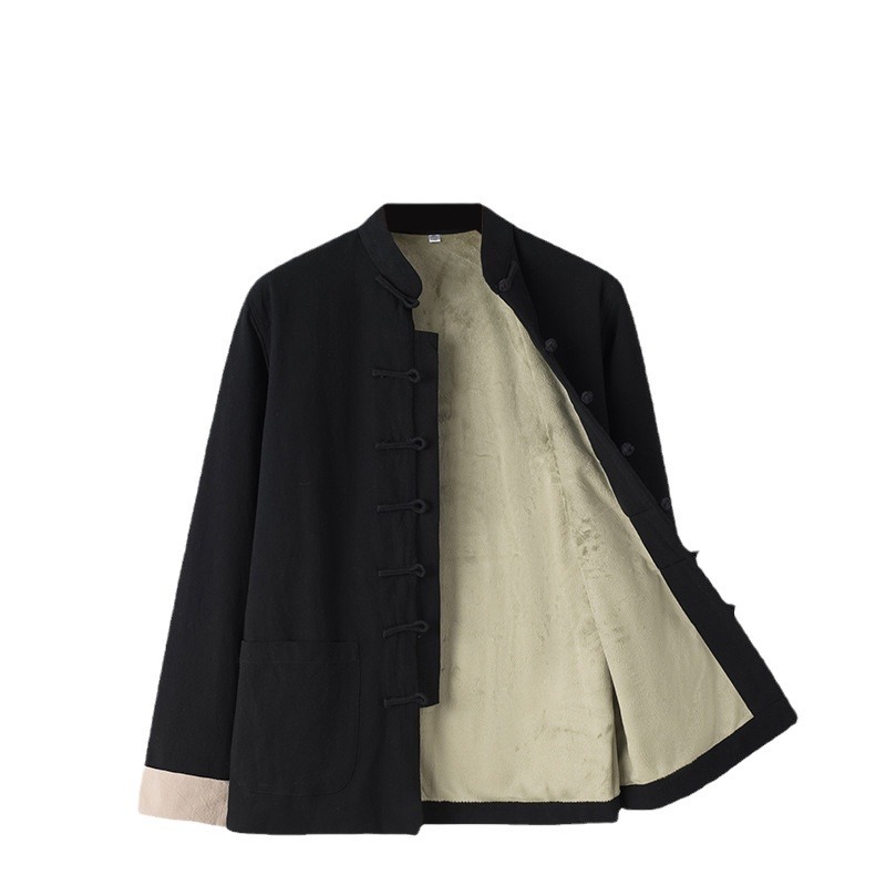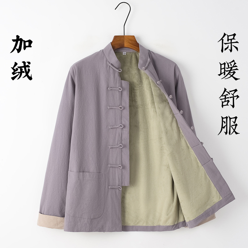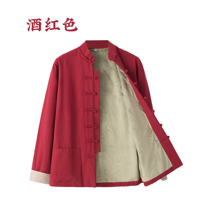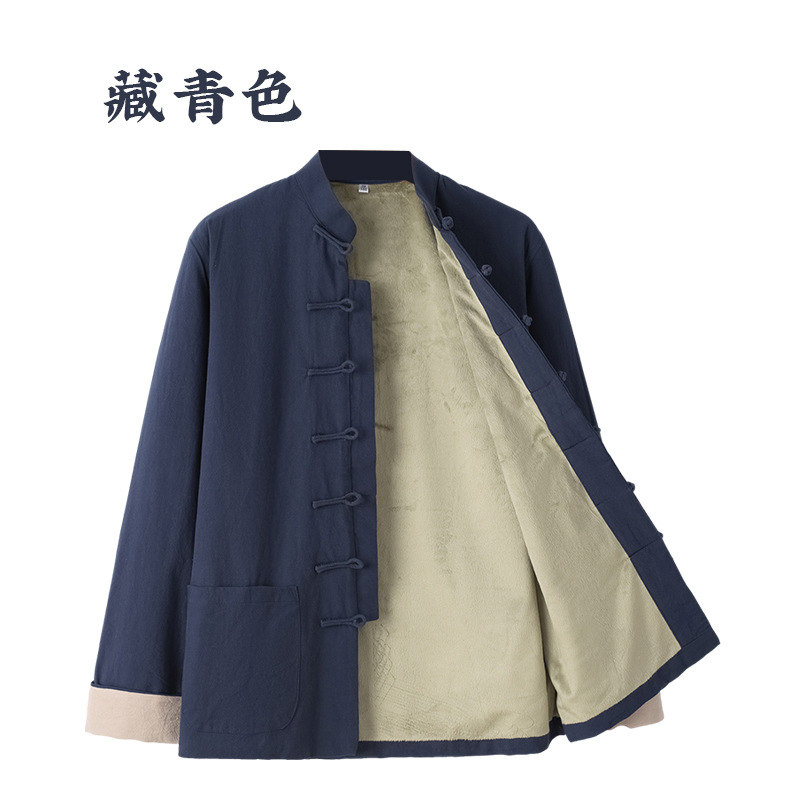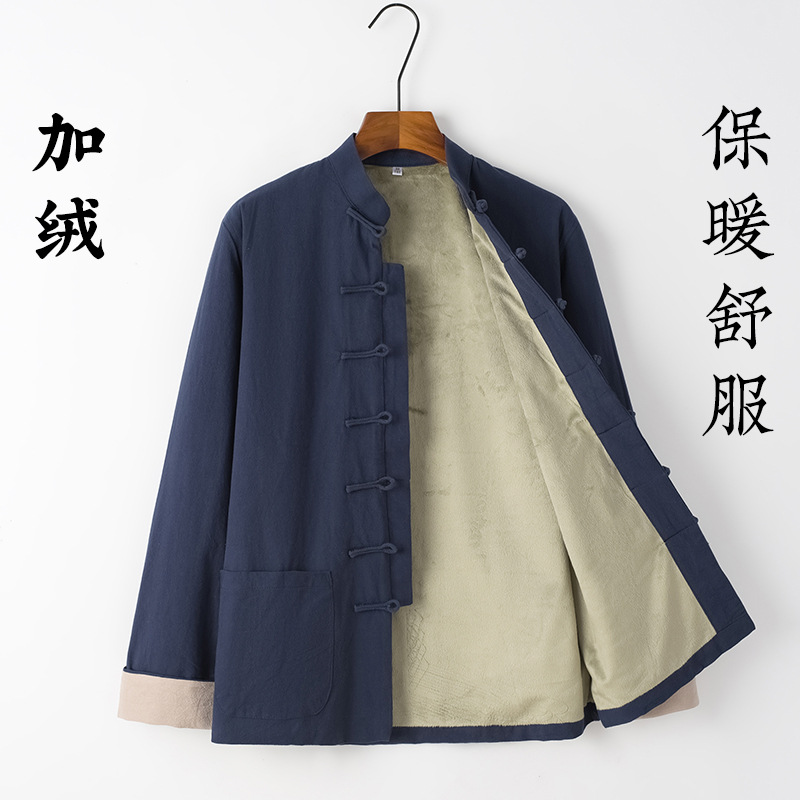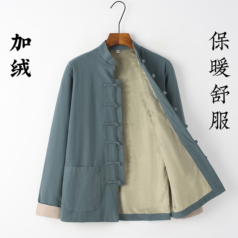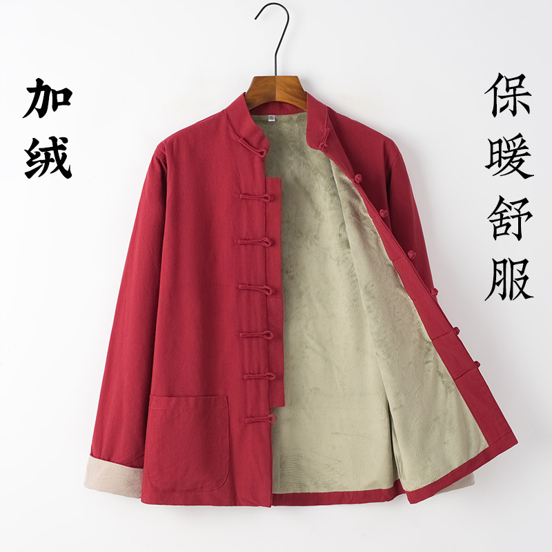 Мужской осенне-зимний костюм Тан для среднего и пожилого возраста, утепленная теплая куртка на флисовой подкладке, Мужской Топ в китайском стиле с пряжкой и воротником-стойкой