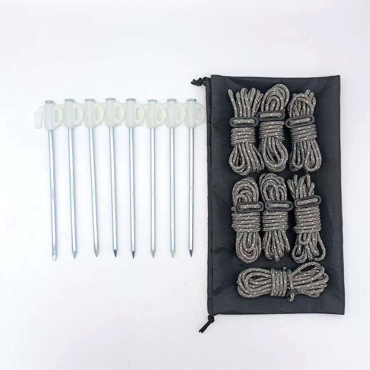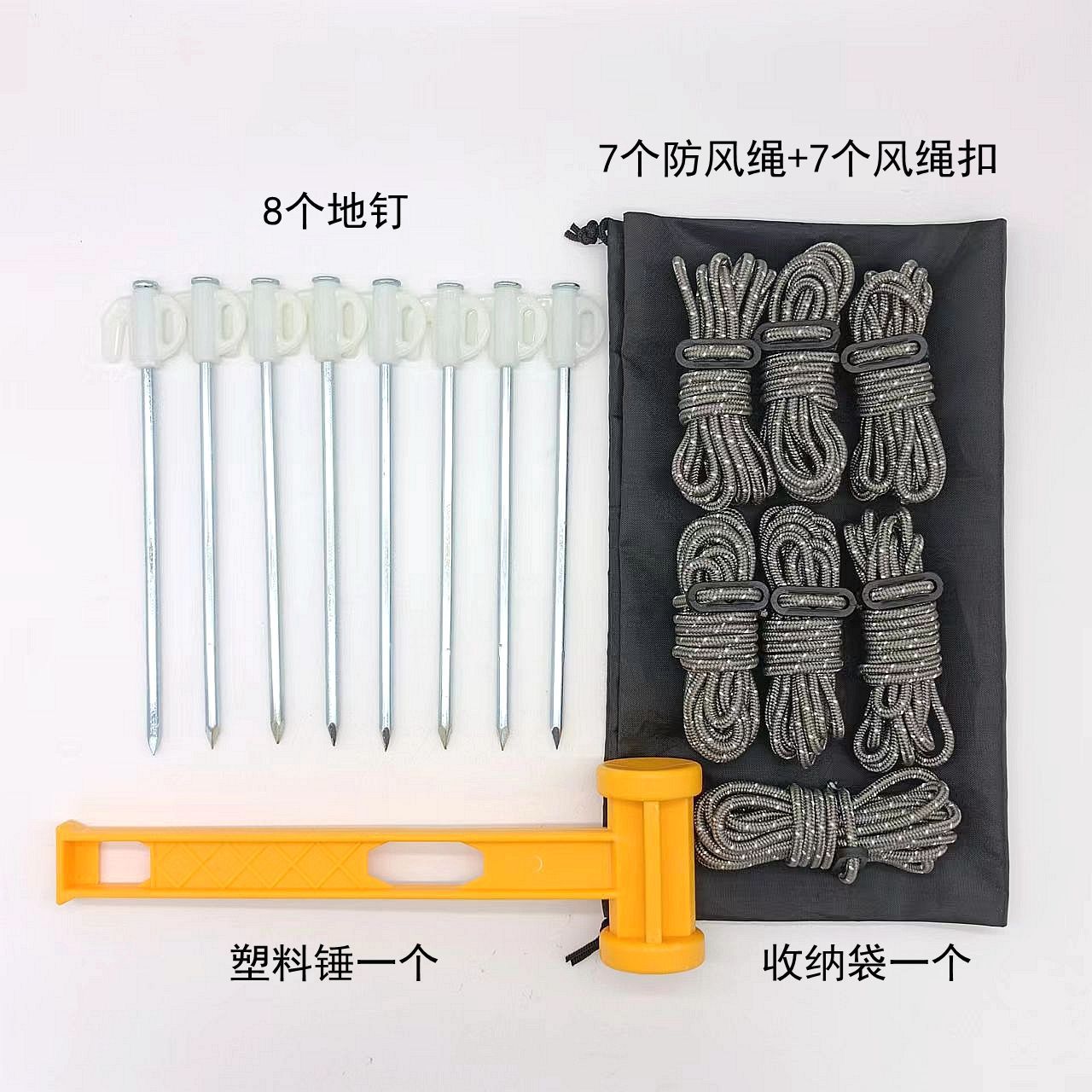 地钉套装:收纳袋一个 塑料锤一个 荧光地钉8根 防风绳7根 三眼风绳扣7个