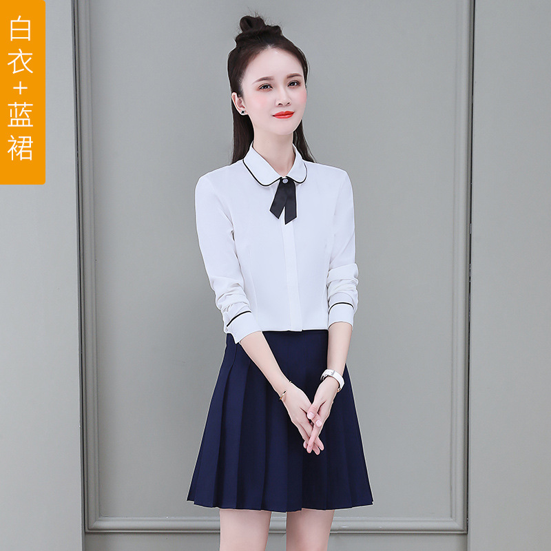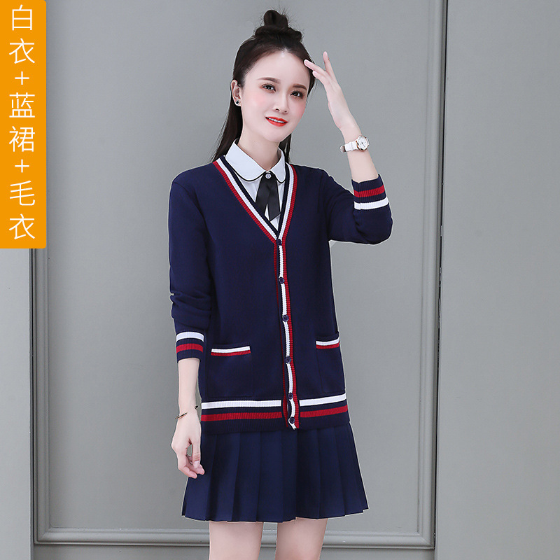 Белая одежда + синяя юбка + свитер; Синий Свитер; Белая рубашка; Синяя плиссированная юбка; Белая рубашка + синяя юбка