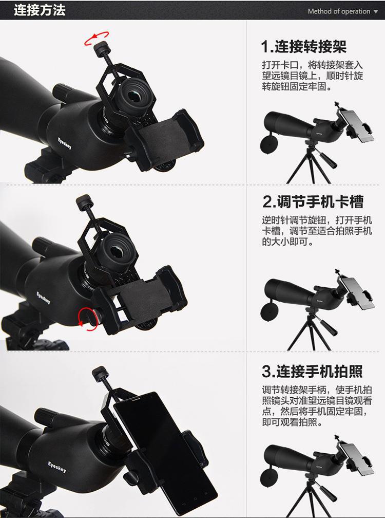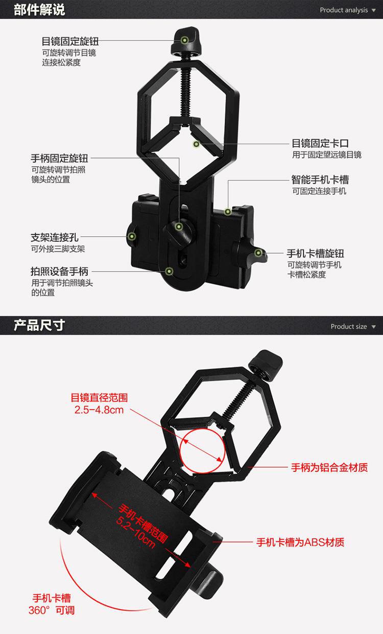 铝合金手柄+金属拉杆底座 目镜范围:25-48mm,手机宽度:52-100mm默认彩盒包装。