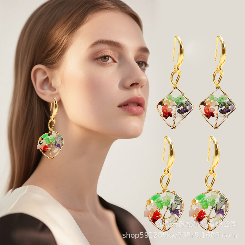 Древо Жизни Серьги-Крючки из натурального камня с кристаллами ручной работы, обернутые медной проволокой, Красочные оригинальные серьги с гравием, ювелирные изделия