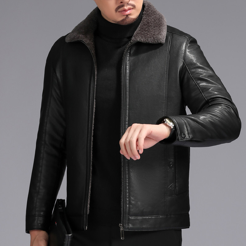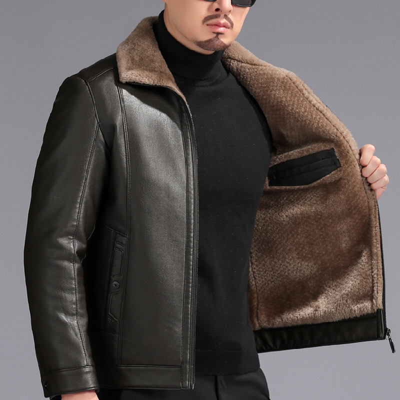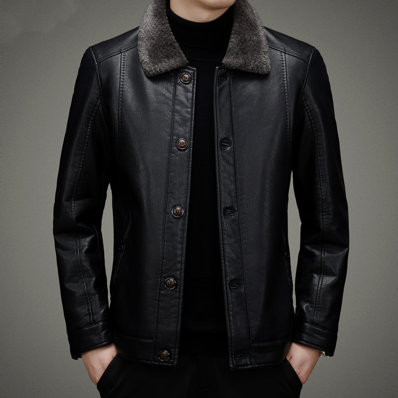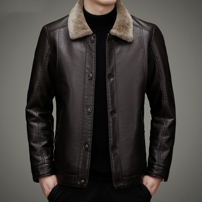 Куртка из натуральной кожи, Мужская Утепленная зимняя меховая куртка на флисовой подкладке, мужская кожаная куртка на пуговицах для папы среднего возраста, пальто с лацканами