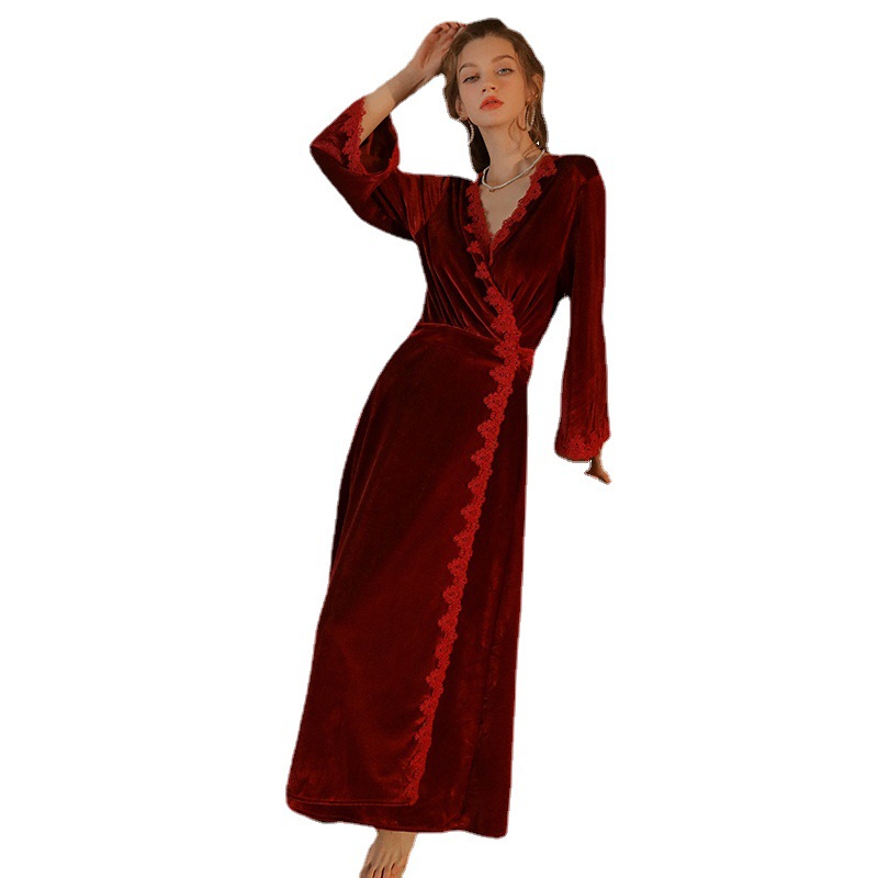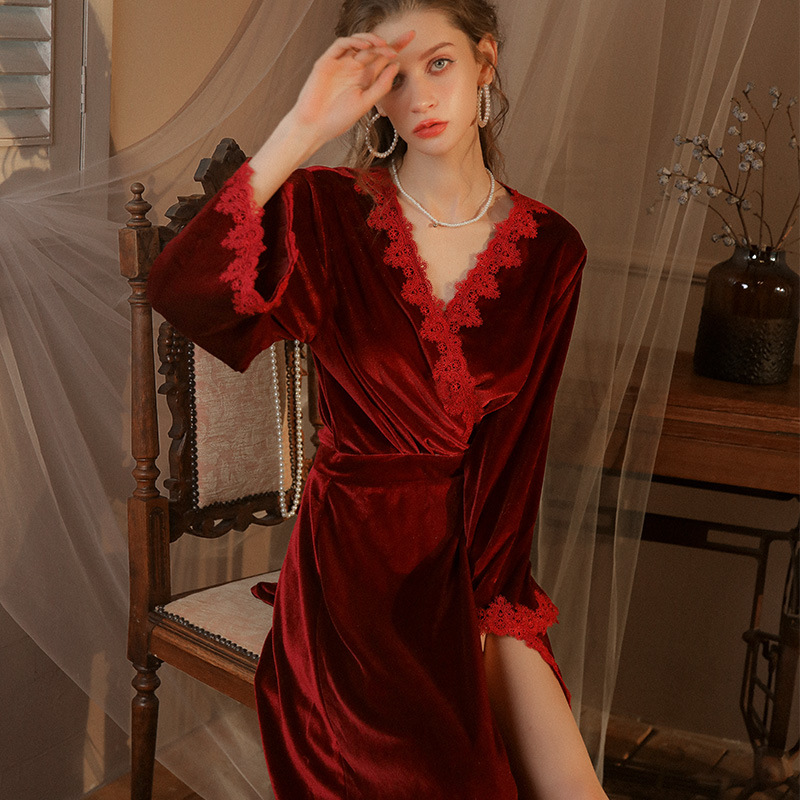 Кружевное утреннее платье Женская Невеста подружки невесты Золотая Бархатная длинная ночная рубашка весна-осень свадьба красные пижамы